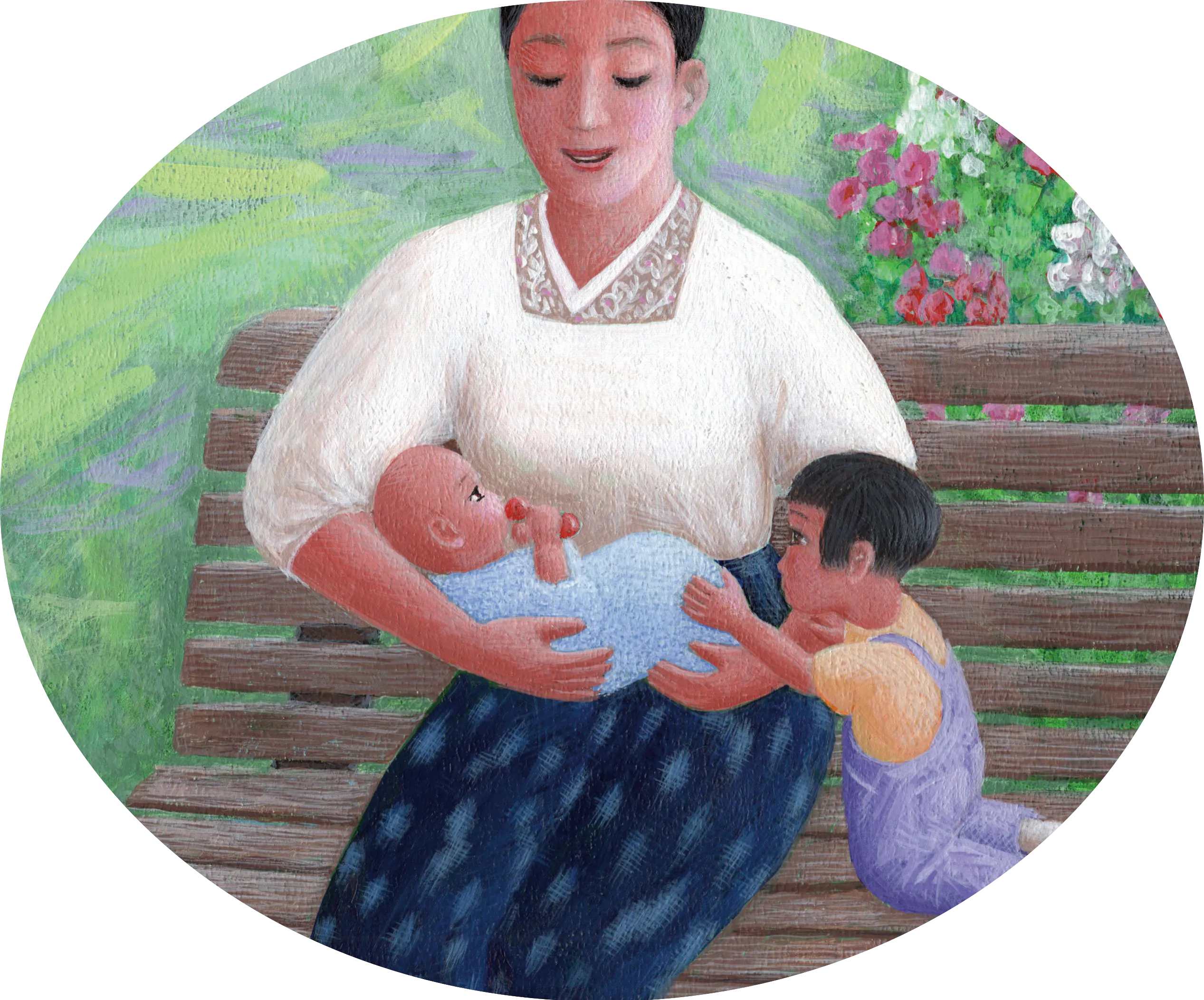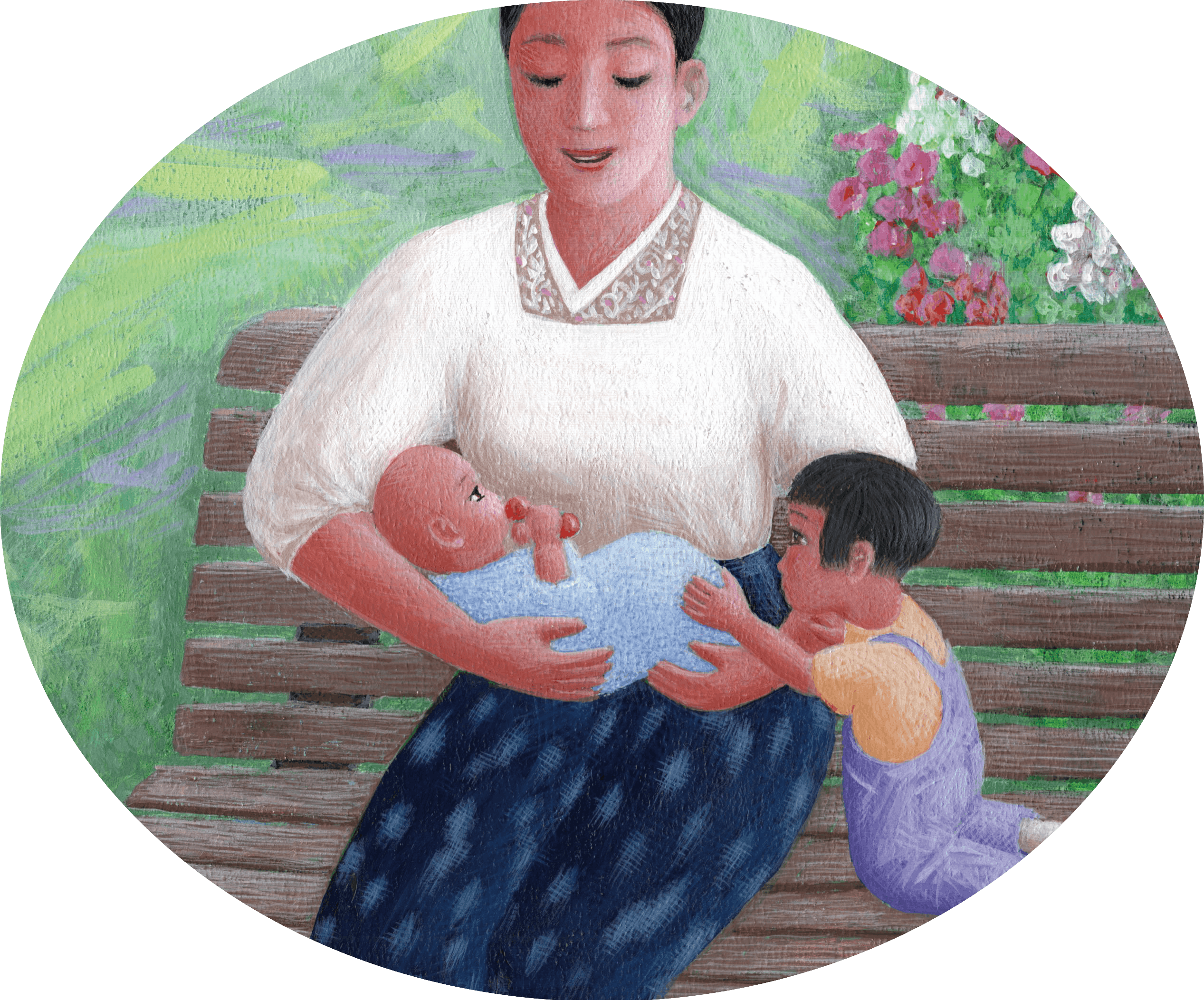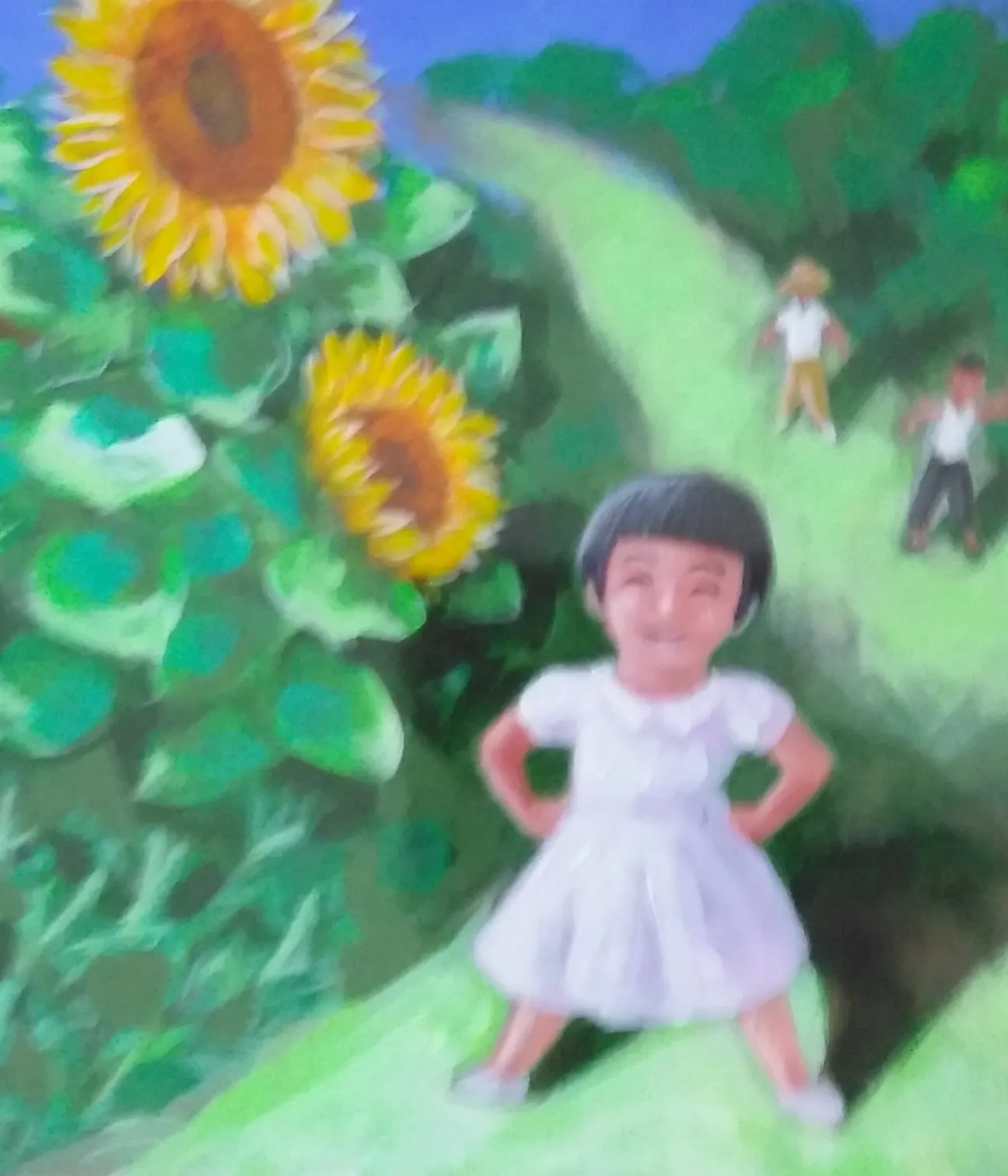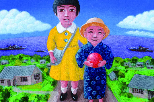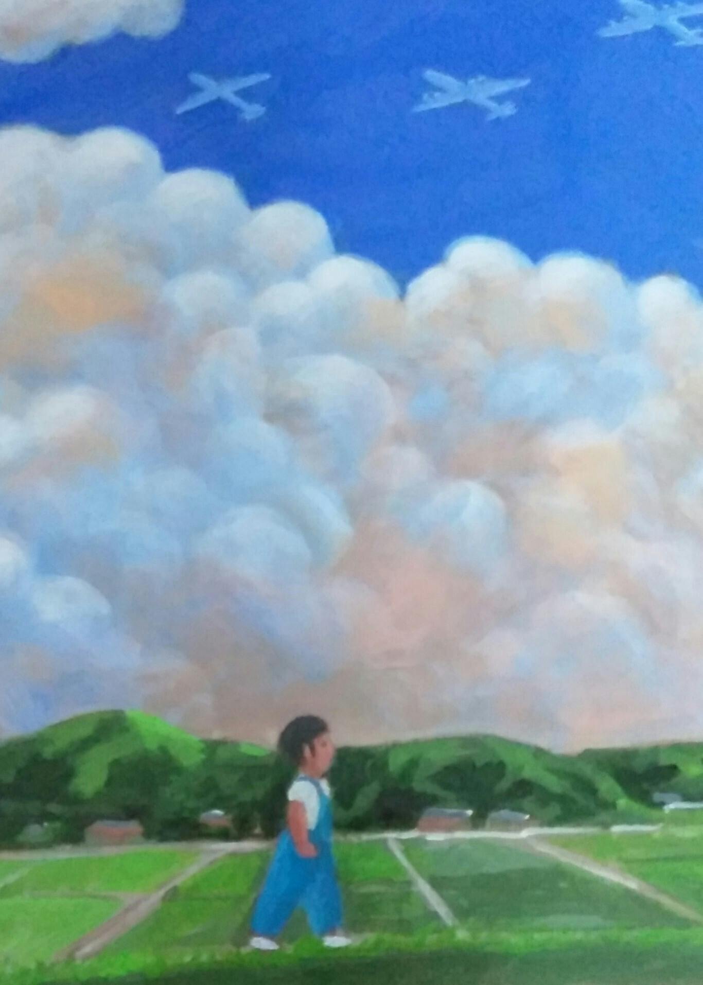 明るく美しい絵にしていただきました。絵を男性の画家にお願いしたのは、迫力ある戦争場面を描いていただきた