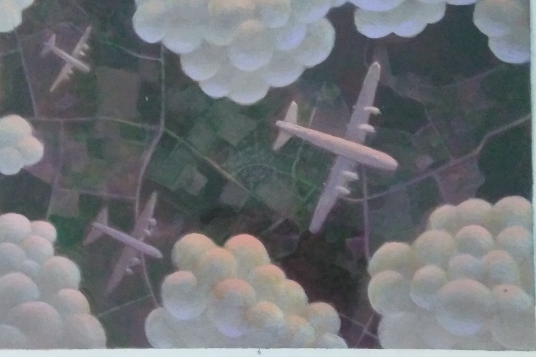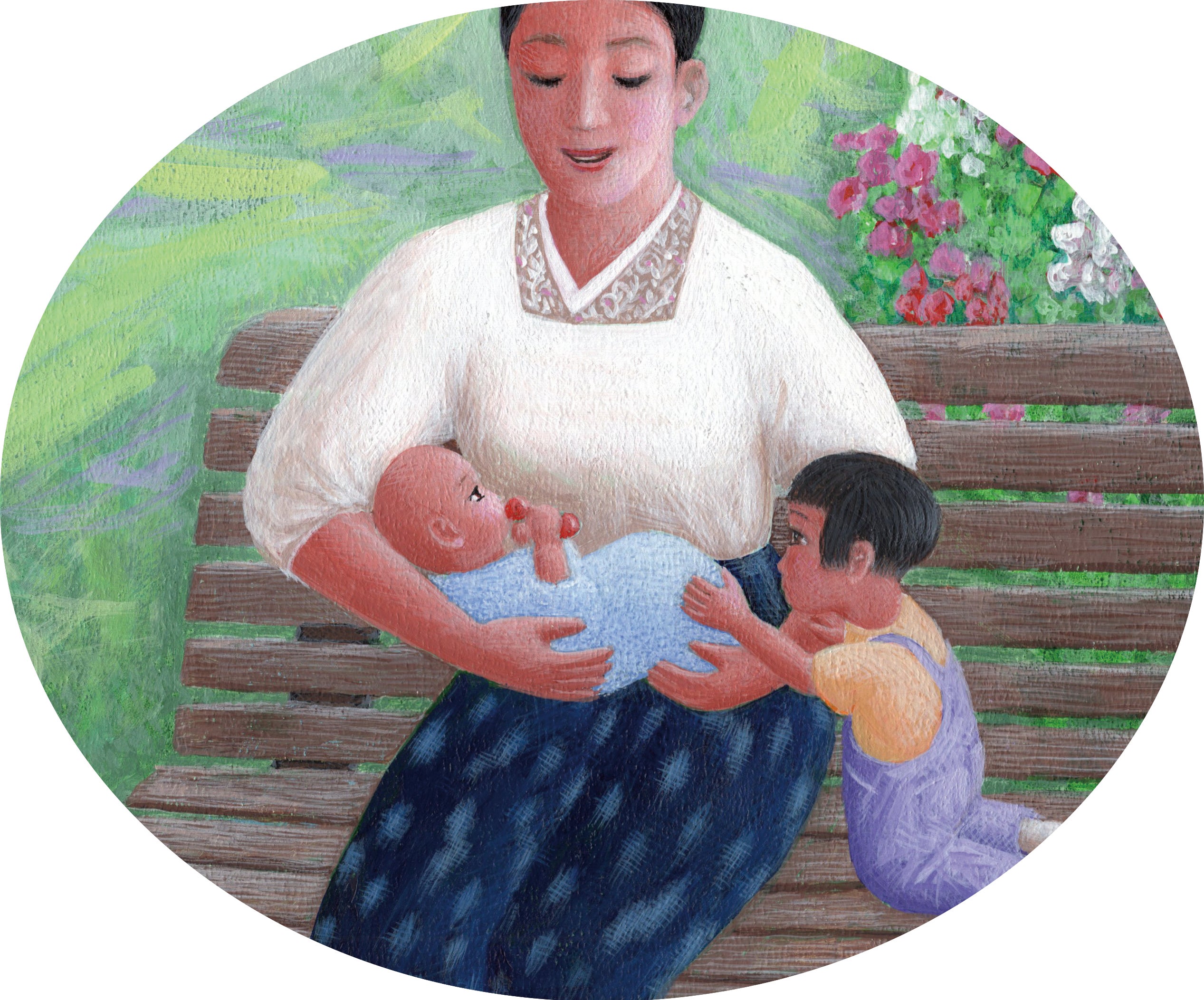 明るく美しい絵にしていただきました。絵を男性の画家にお願いしたのは、迫力ある戦争場面を描いていただきた