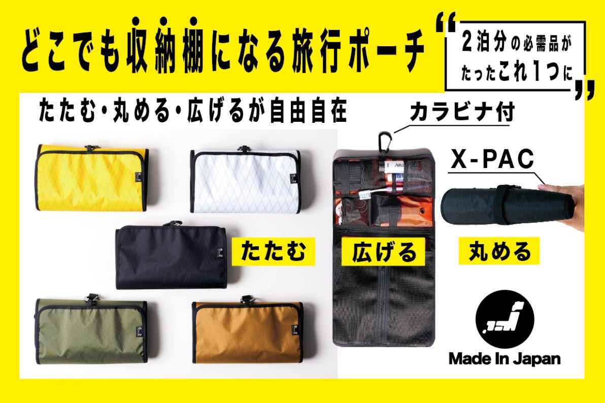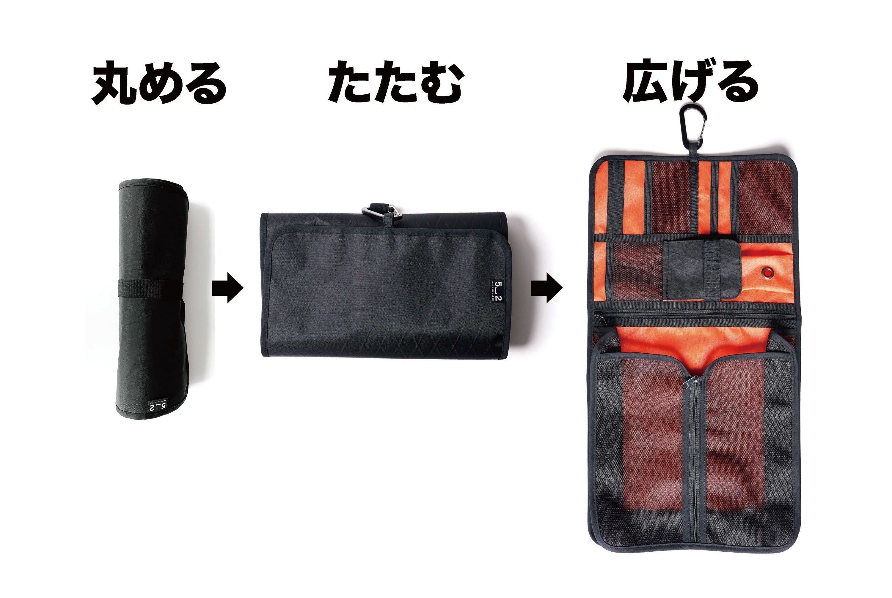 5_2(komatsu)ブランドでは、好評だった第1弾に続き、第2弾として「丸める」「たたむ」「広げる」が自由自在の2泊分の必需品がコンパクトに1つにまとめられる旅行ポーチを1年間の歳月をかけて開発しました。