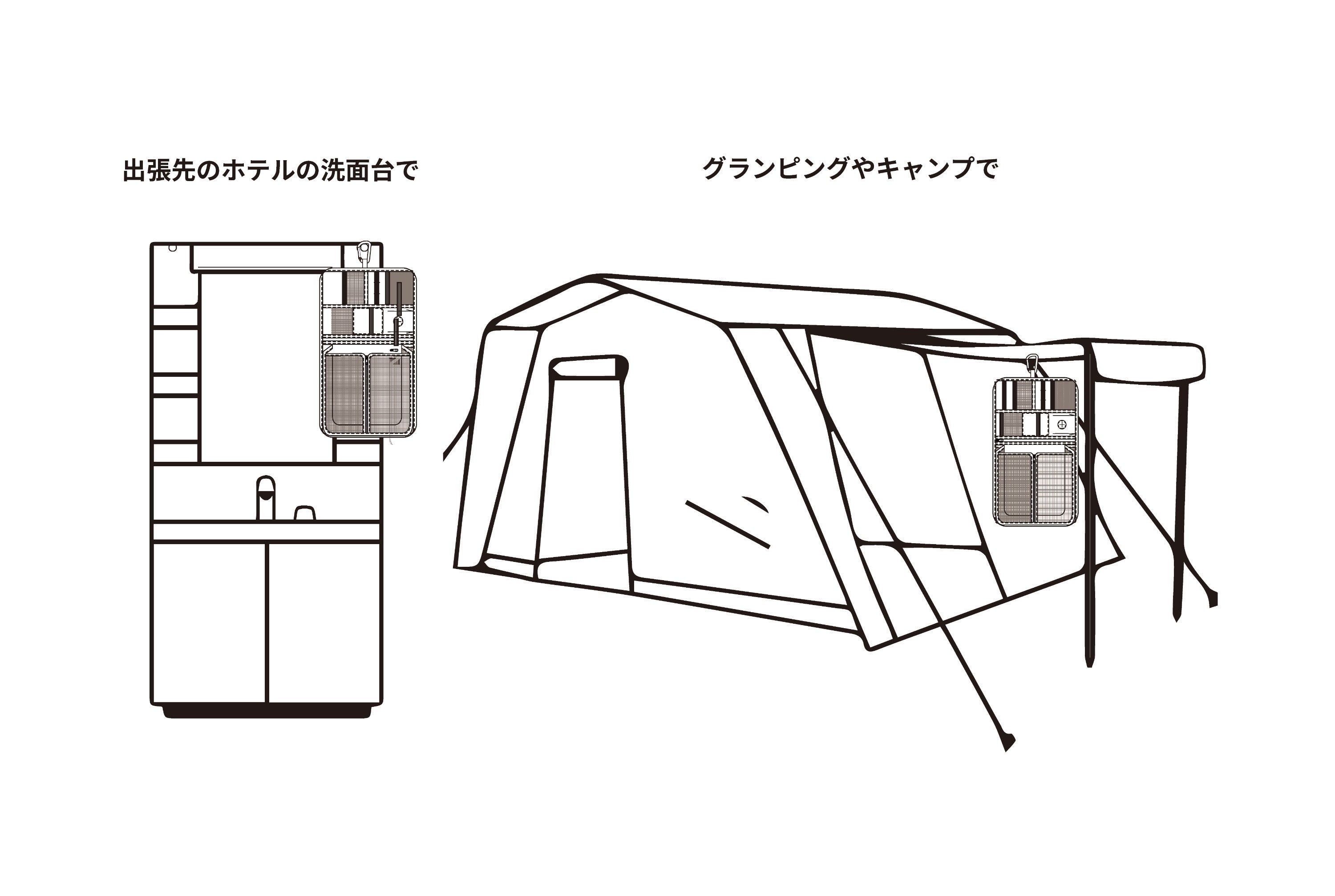 【移動先では「広げる」ことでポーチの中身が一目で分かる収納棚に。専用ポケットで忘れ物ゼロ革命!】