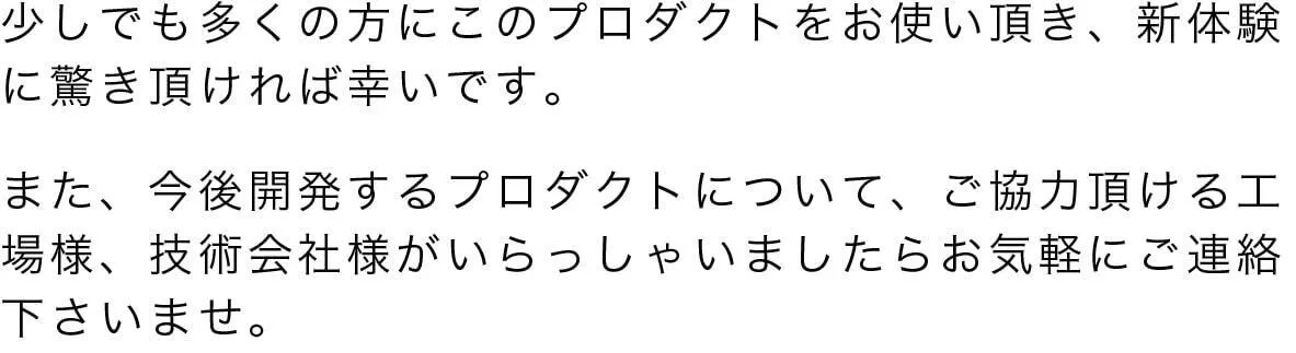 私達は日本の電動歯ブラシ普及率16%をなんとかしたいと考え、ミニマルソニックを誕生させました。口腔内のケアは大変重要なものであるにも関わらず、そのツールの進歩はまだまだです。ミニマルソニックが少しでも日本の電動歯ブラシ普及のきっかけになれば大変嬉しいです。