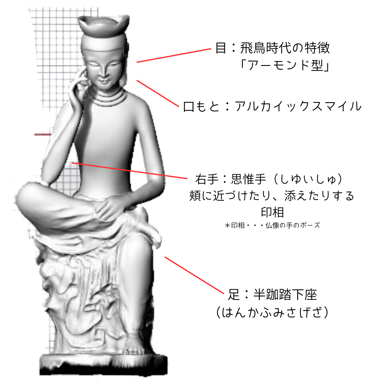 この物思いにふけるような独特の姿は、半跏思惟像(はんかしゆいぞう)と呼ばれています。