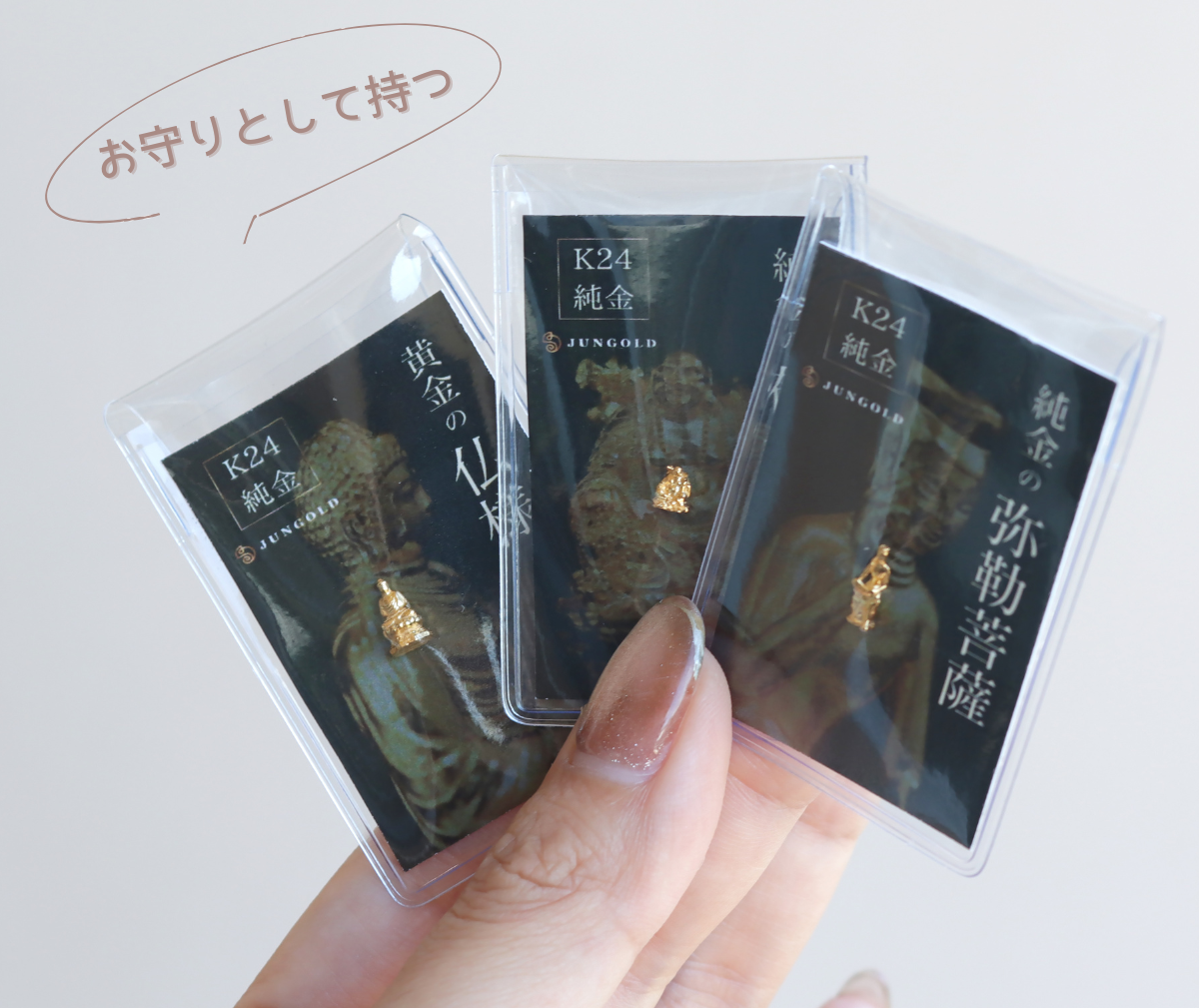 念持仏の多くは50センチほどの木でできた仏像でした。お家に置くならば問題ないですが、JUOGOLDの念持仏は、なんとお守りサイズ。しかも無垢の純金製です。