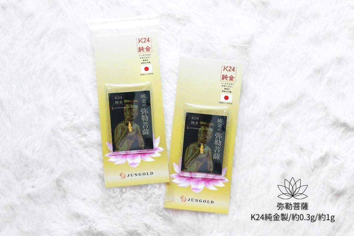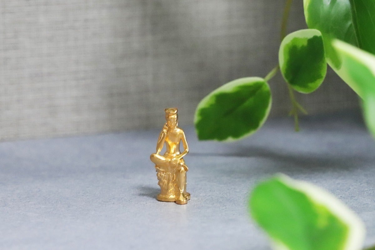 純金の弥勒菩薩像は、二つの特徴である「考える姿」と「ほほ笑み」の表現にこだわって作りました。約1gからの極小サイズながら、細部までこだわって作るのがJUNGOLD製品の魅力です。