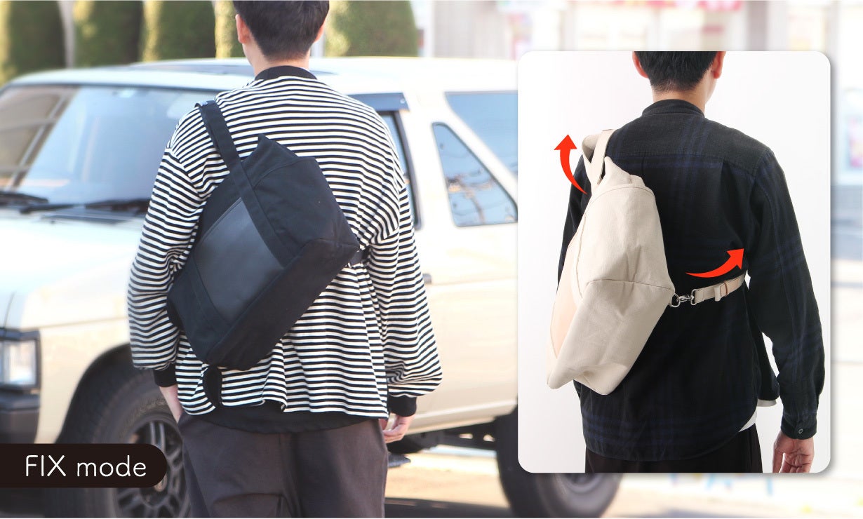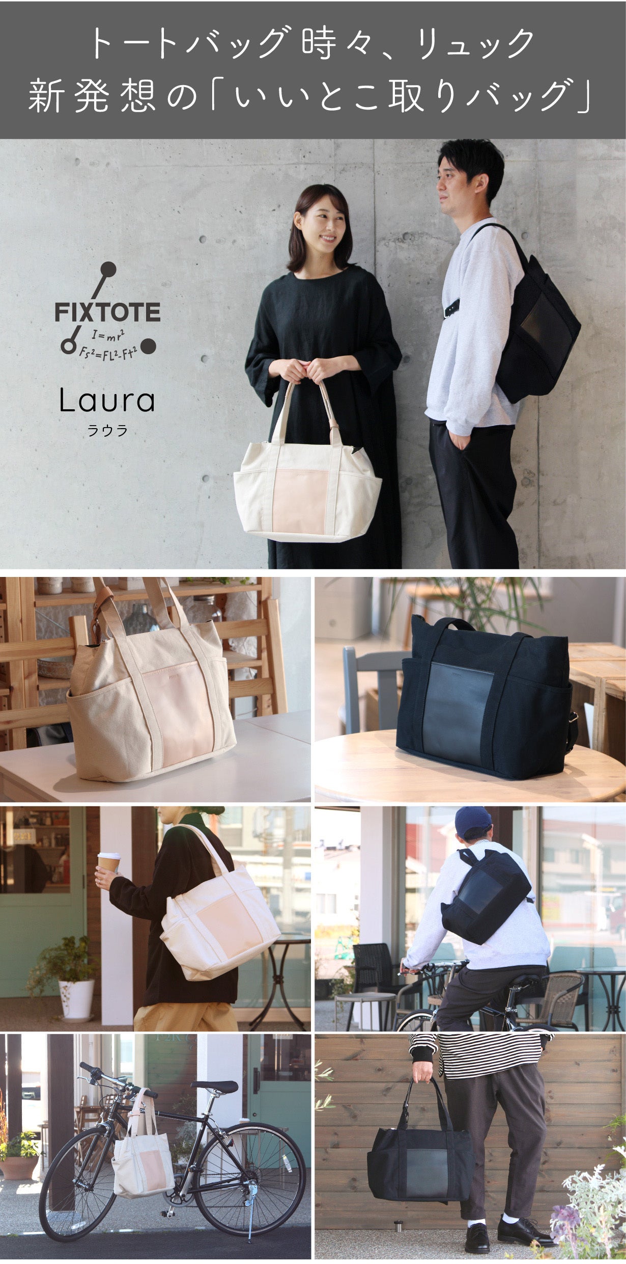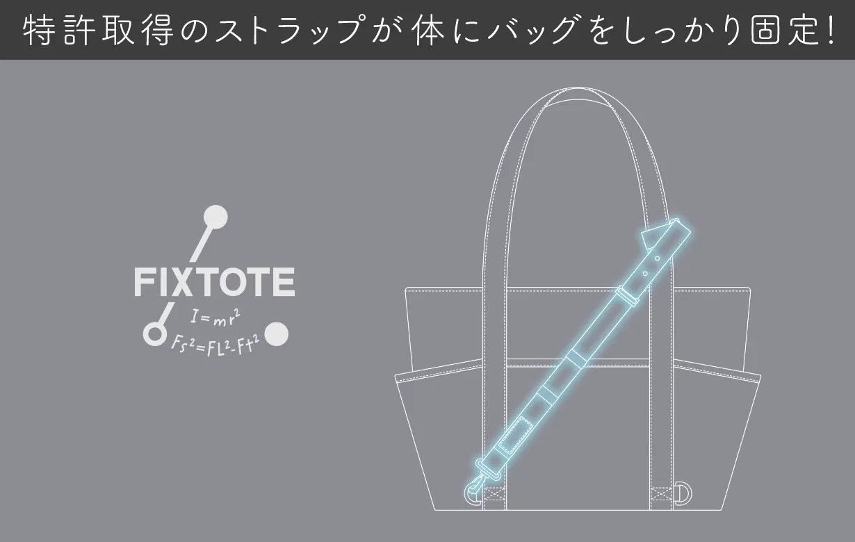 『FIXTOTE(フィックストート)』とは、日本を含む世界8か国特許取得※1 のストラップにより、身体にバッグを「固定」。揺れたり、ズリ落ちたりせず、身体に発生する各ストレスを大幅軽減できるバッグです!回を重ねる毎に進化を続けてきたFIXTOTEに、ついに待望の横型トートタイプ『ラウラ』が新登場!