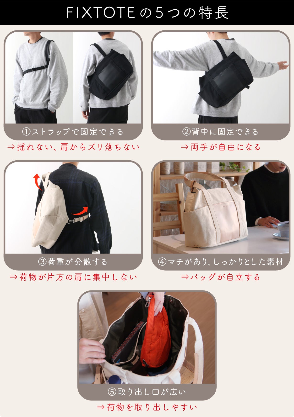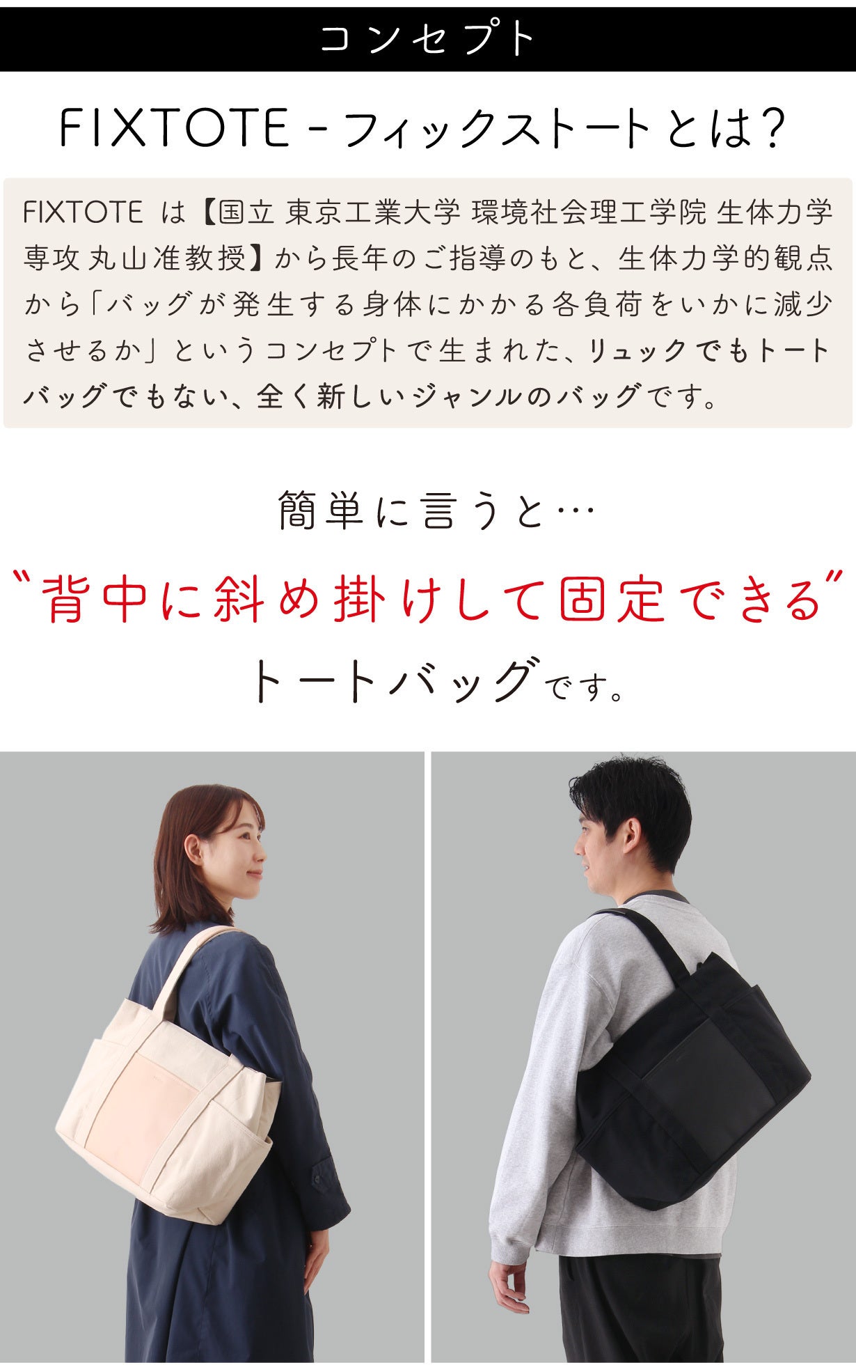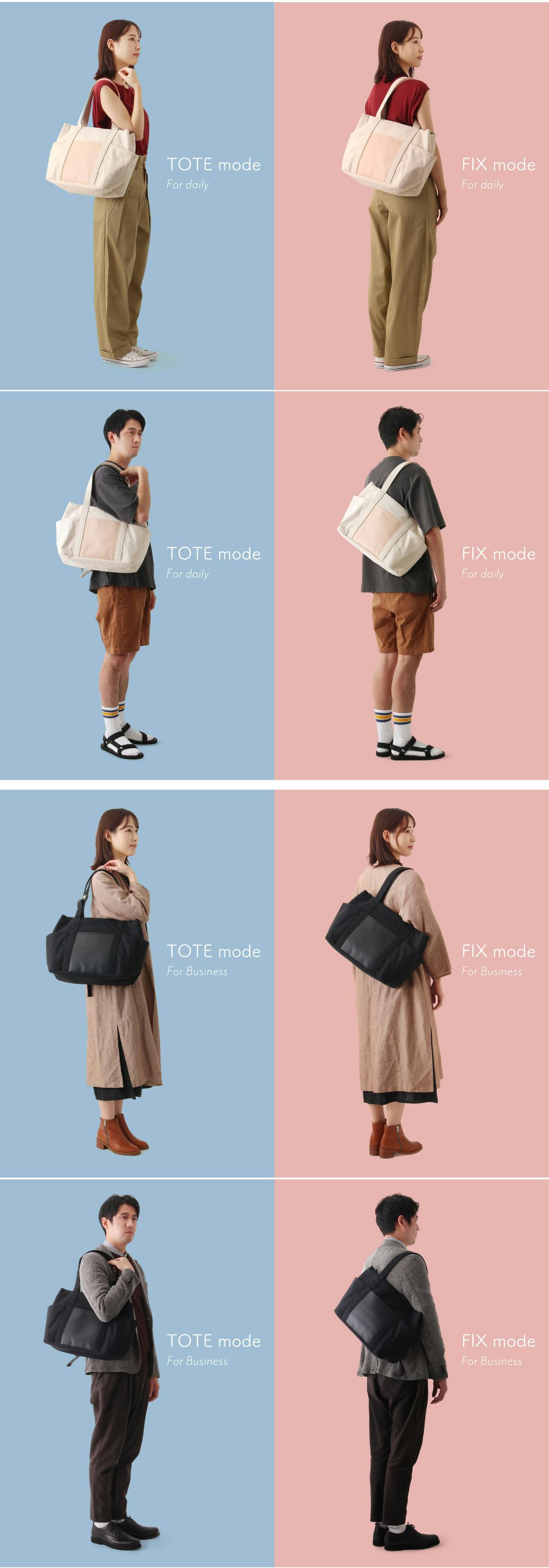 『FIXTOTE(フィックストート)』とは、日本を含む世界8か国特許取得※1 のストラップにより、身体にバッグを「固定」。揺れたり、ズリ落ちたりせず、身体に発生する各ストレスを大幅軽減できるバッグです!回を重ねる毎に進化を続けてきたFIXTOTEに、ついに待望の横型トートタイプ『ラウラ』が新登場!