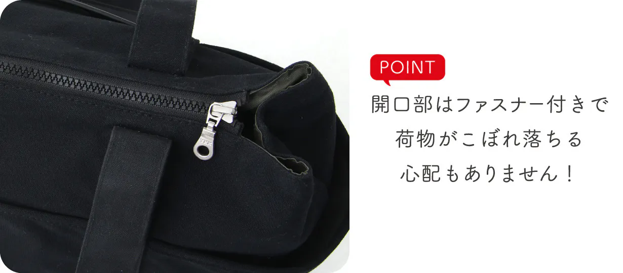 取り出し口にはファスナーが付属、中の荷物を守ります。