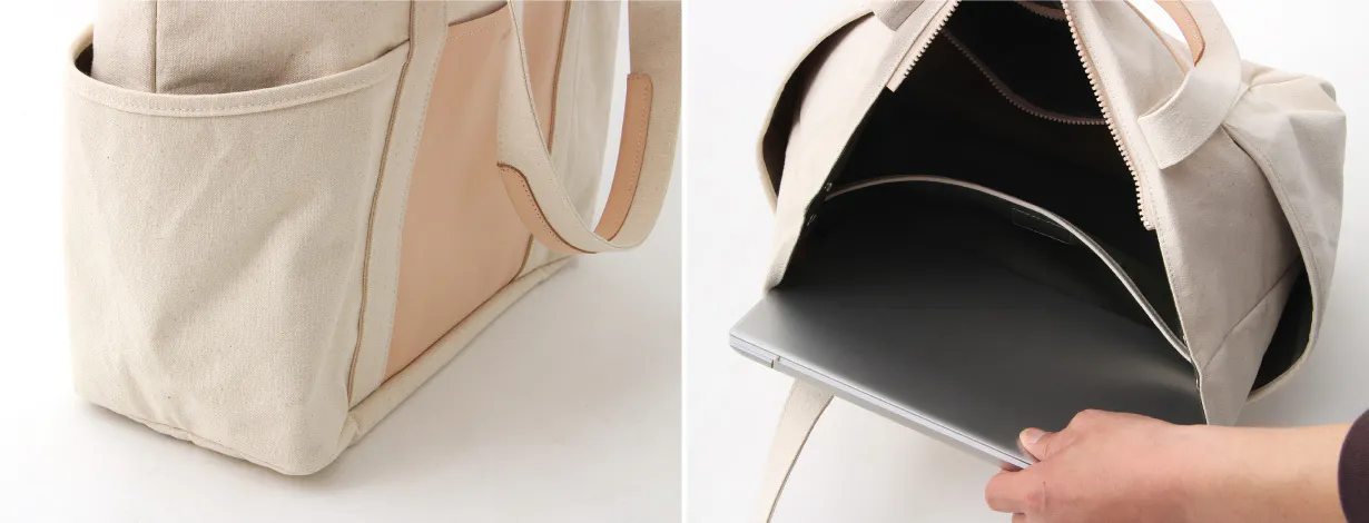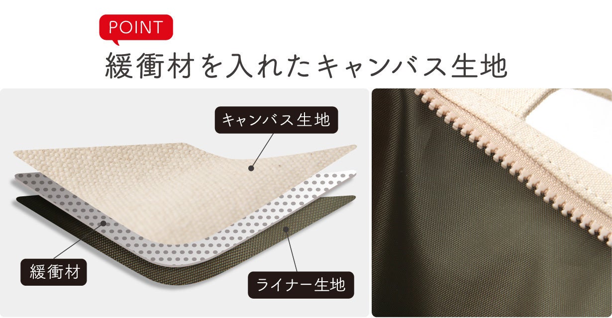 キャンバス生地とライナーの間に緩衝材を入れることで適度な強度ができ、バッグが自立します。