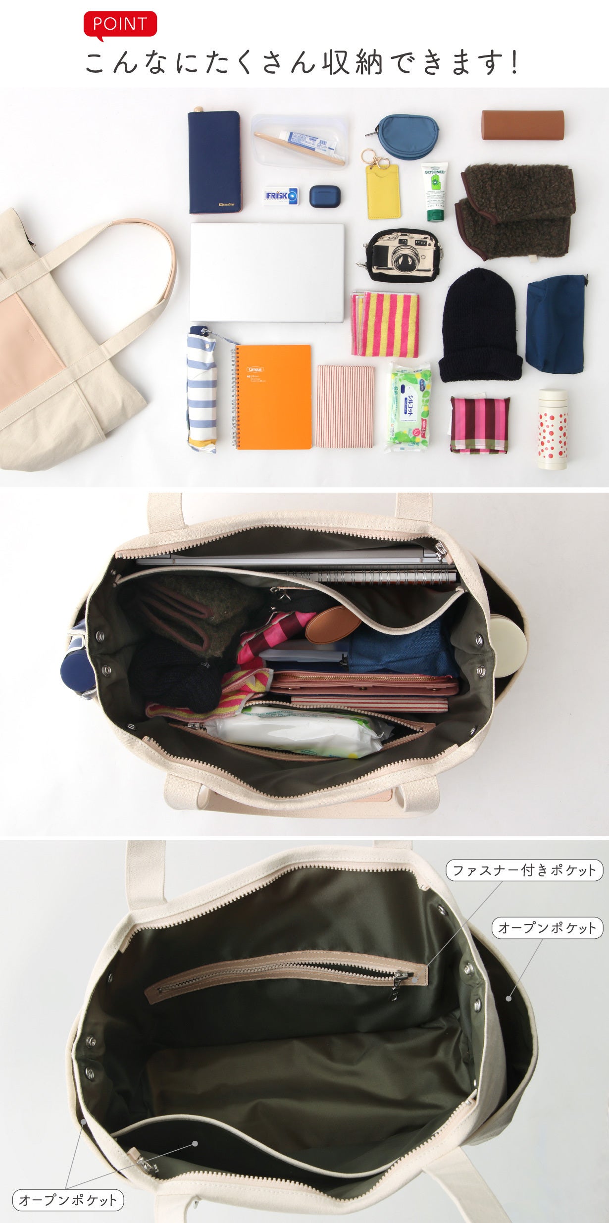 内側にはオープンポケット×1とファスナー付ポケット×1があり、外側にもオープンポケットが4つあります。両サイドは大きめのポケットなので水筒や折傘を入れるのに便利♪