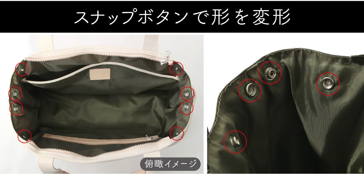 赤丸部分のスナップボタンをとめることでバッグの形状を変えることができます。