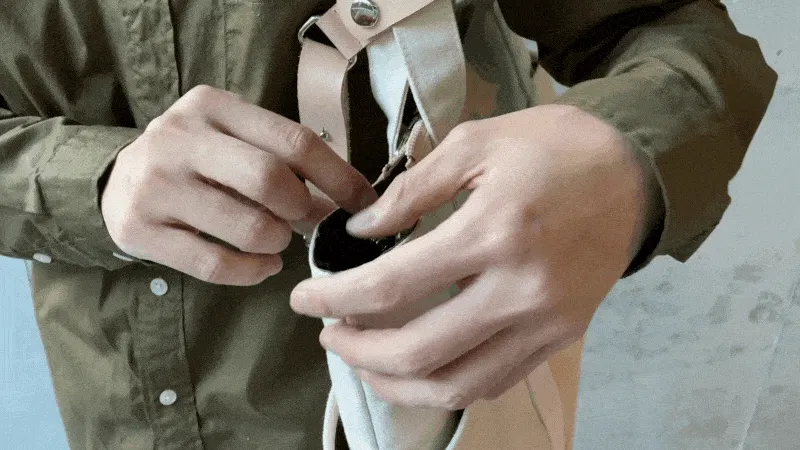 体に固定するストラップを外さずにバッグの持ち手のみを離せます。