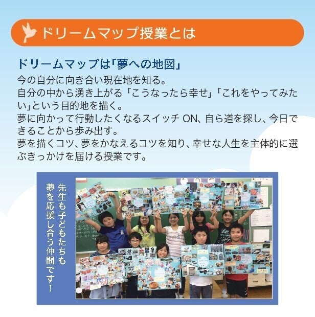 ゆめドリが公立の学校での授業を大切にするのは、自分の中から湧き出る想いに気づき、可能性に挑戦し人生を切り開いて行くチカラを、一人でも多くの子どもたちに身に付けて欲しいからです。 ドリームマップ授業をきっかけに、一人一人が自分らしい幸せな人生への一歩を踏み出し、こどもも大人も幸せに、平和に生きる未来の作り手となることを心から願っています。 社会構造、産業構造が急激に変化して行く社会で、どんな環境に直面しても生き抜くチカラを育む授業を、全国どの地域の学校 でも実施できることを目指しています。