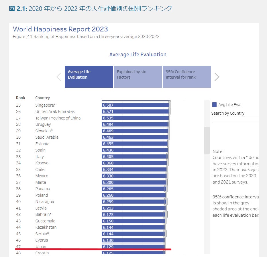 「World Happiness Report(世界幸福度報告書)」の2023年版国別の幸福度ランキングによると、日本の順位は137カ国中47位でした。