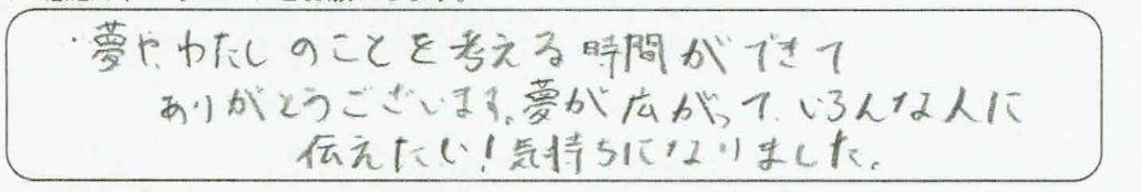 「どんなことでもいいよ、いくつ書いてもいいよ、後で変わっても大丈夫だよ」「こうだったら最高!と思うことは?」などと声をかけ、安心してもらい夢に制限はないという事を感じてもらいます。