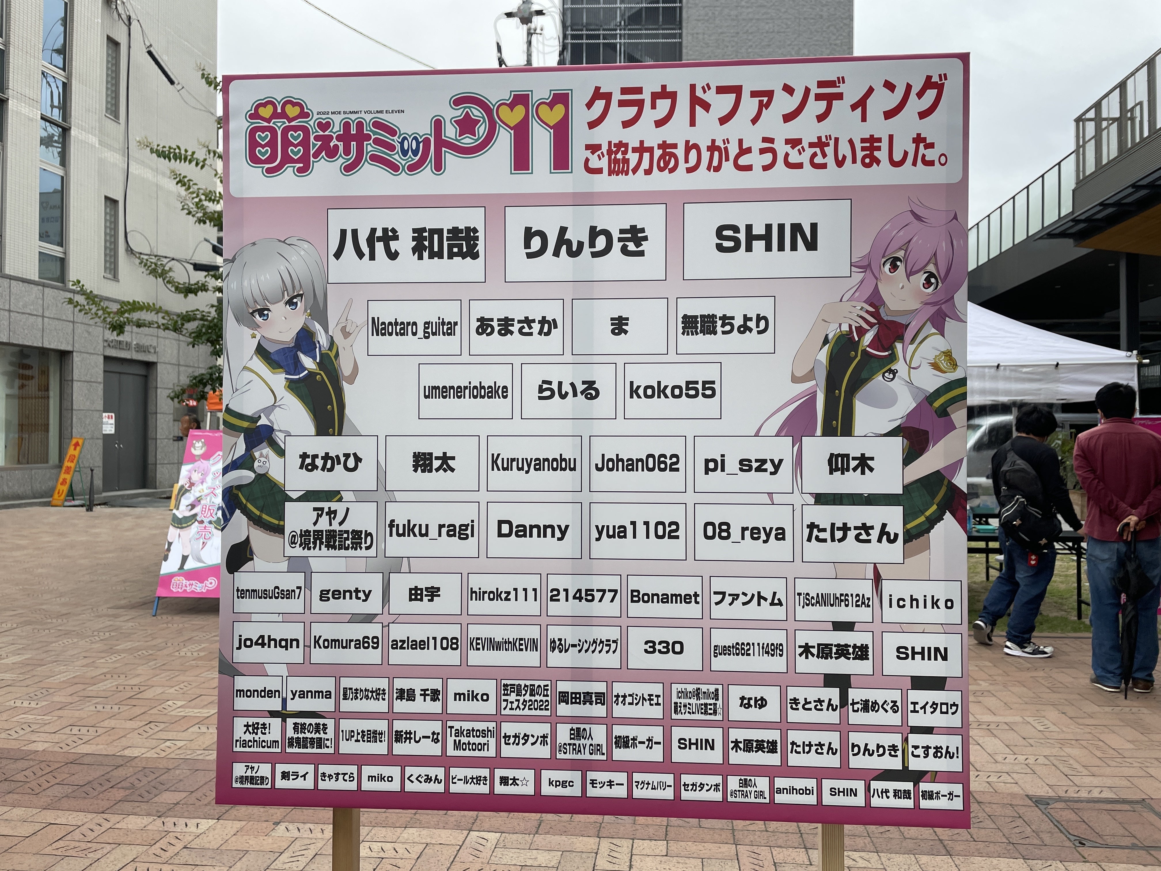 ライジングホールに行った方は分かると思うんですが、階段のところにあった演者さんの名前入りのぼりも、萌えサミファンディングで応援してくださった支援者さんののぼりになります。