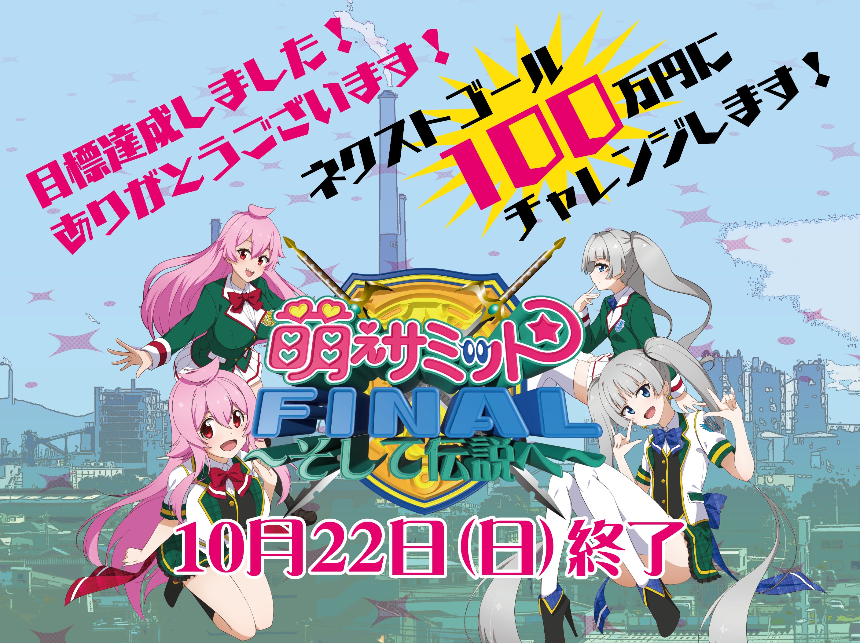 《ネクストゴールに挑戦します!》おかげさまで、過去最速!クラウドファンディング開始初日で目標金額の50万円を達成することができました!ご支援いただいた皆様、本当にありがとうございます!目標は達成しましたが、期限はまだ残っています。最後の萌えサミをより充実したイベントにするために、更なるご支援をよろしくお願いいたします!※追加リターンは、昨年に引き続き、地元山口県周南市出身声優 竹本英史さんのトークショーS席です!