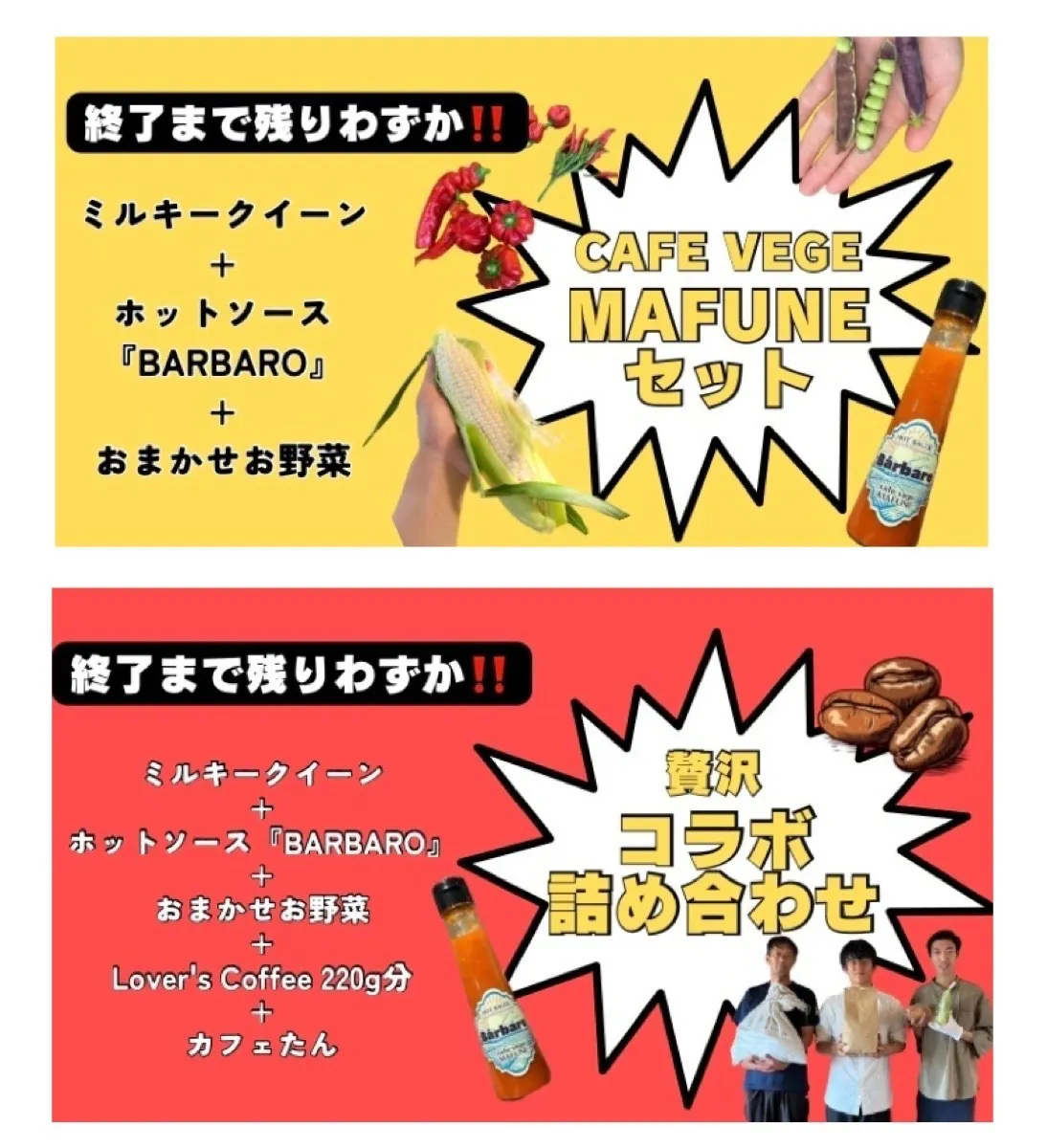 2024/01/20 11:30いよいよ、あと9日となりました!ご支援いただいた皆様のおかげで目標金額の55%達成することができました。応援していただきありがとうございます。ラストスパートもまだまだ頑張っていきますよ!!さて、ラストスパートに向けて新プランも追加いたしましたので要チェックです◎『CAFE VEGE MAFUNEセット』こちらは今回コラボしていただいてる「間舩農園」さんの詰め合わせセットです。リターン品にもある「カフェたん」を使って大事に育てられたお米「ミルキークイーン」(1Kg)と爽やかな辛さと旨みのあるオリジナルホットソース「BARBARO」、さらに季節の野菜を厳選してお送りさせていただきます♪『贅沢コラボ品詰め合わせセット』こちらのセットは、「CAFE VEGE MAFUNEセット」にサステナブル肥料の「カフェたん」、「Lover's Coffee」さんのコーヒー豆220gがセットになってます!!最後まで応援よろしくお願いいたします!スタッフ一同 もっと見る