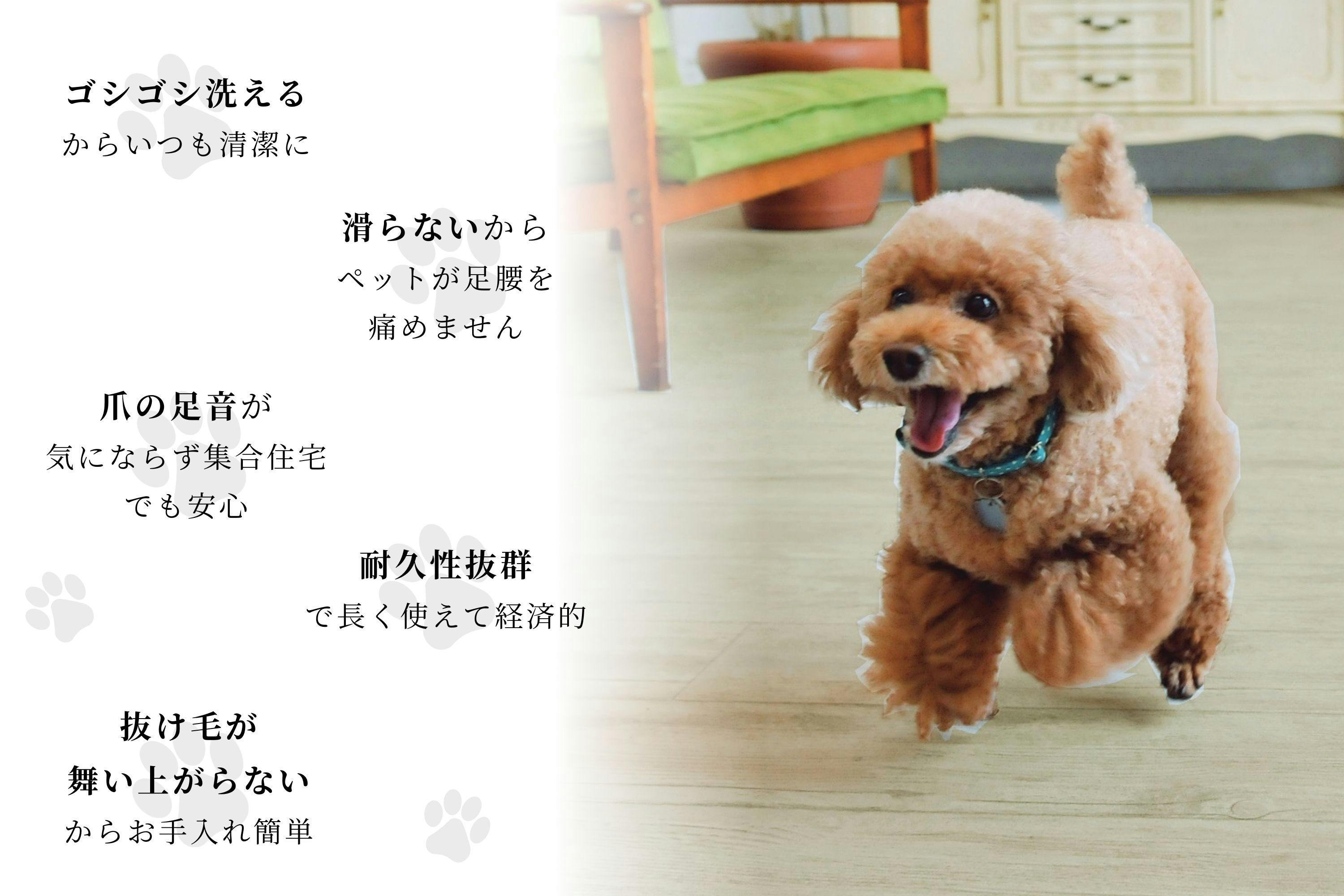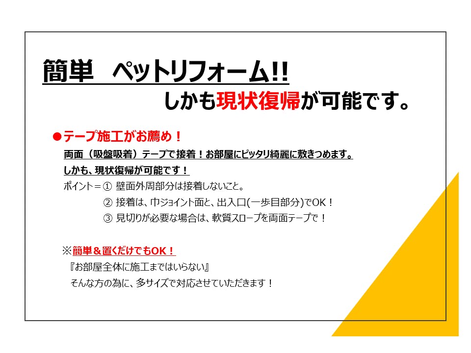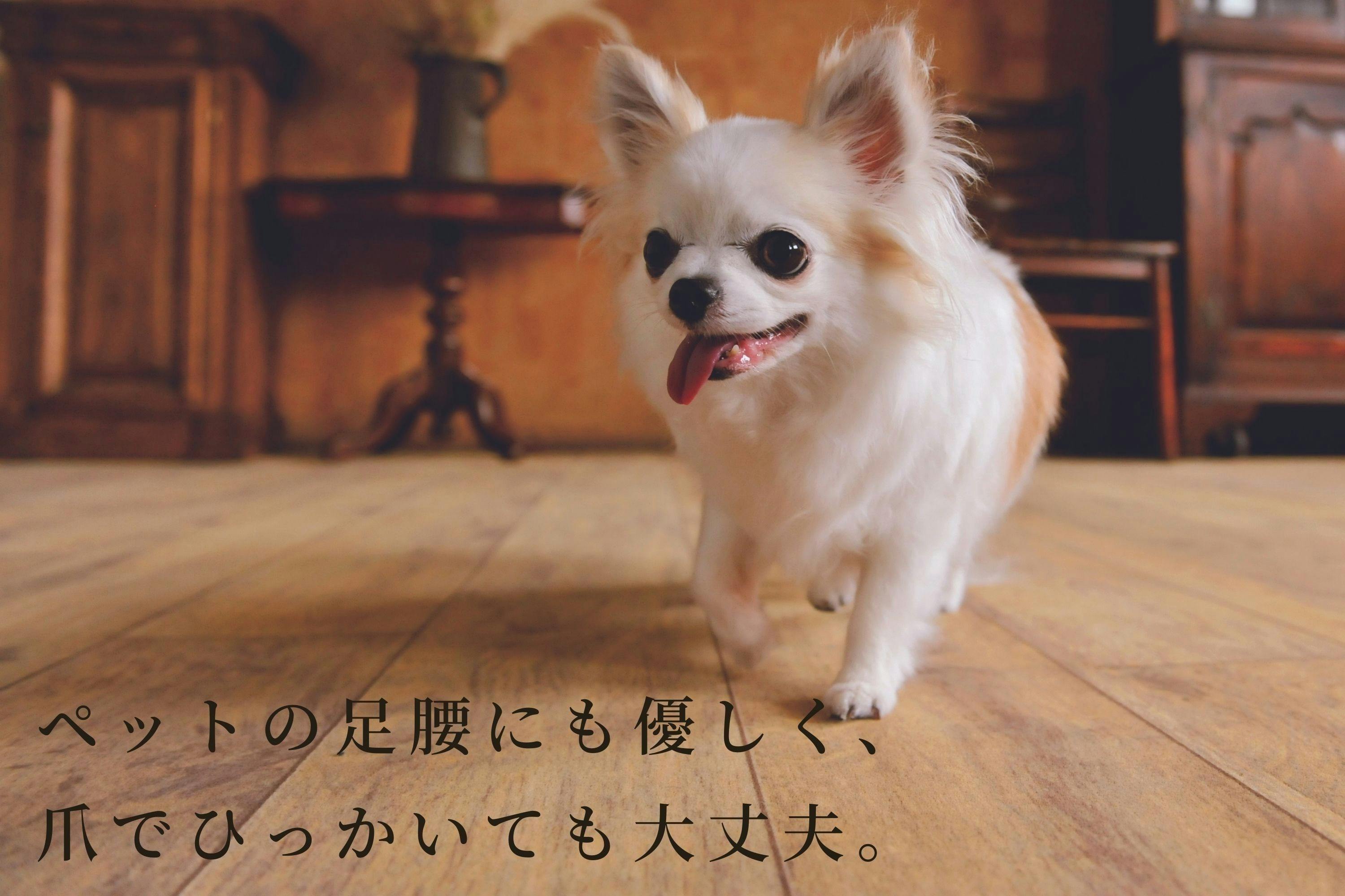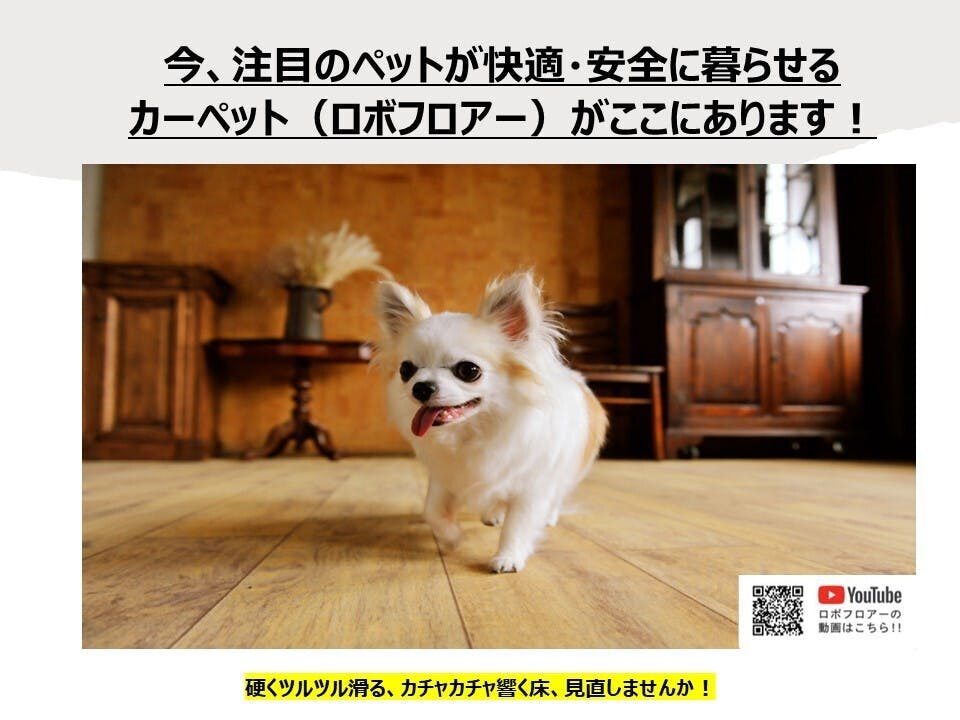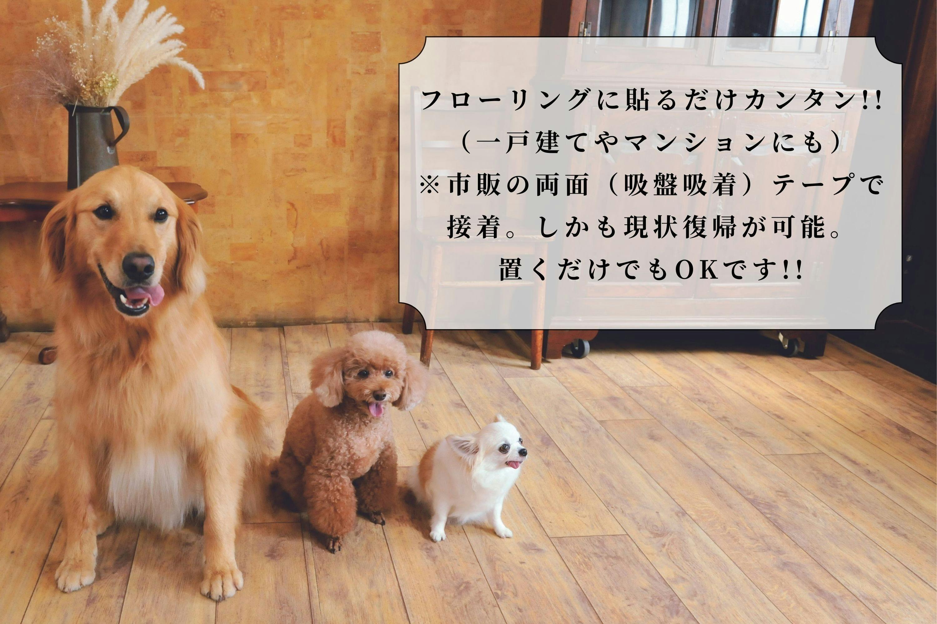 ペットにも快適・安全に暮せるカーペットここに登場!! 硬くツルツル滑る、カチャカチャ響く床の見直しをしてみませんか? 人にやさしい、ペットにやさしい、住まいにやさしい、今、注目のカーペットで悩みを解決。フローリングに貼るだけカンタン!! 市販両面テープ(吸盤吸着)で接着で現状復帰が可能です。置くだけでもOKです。