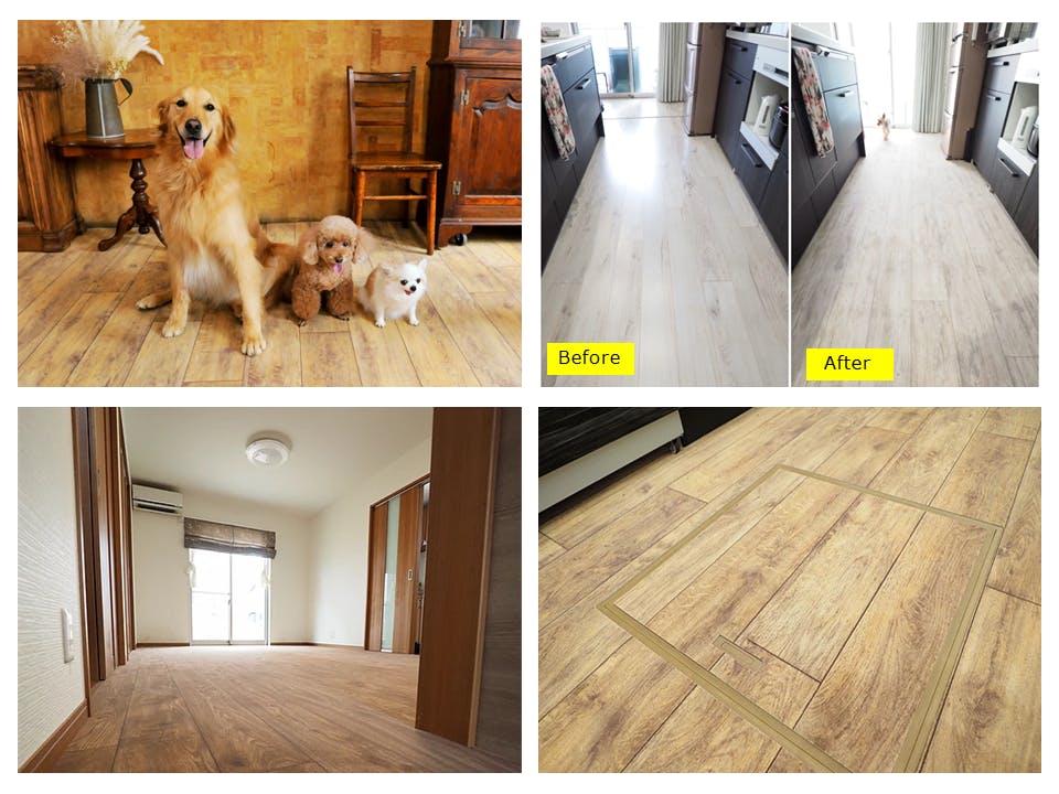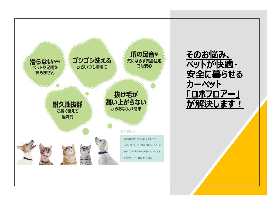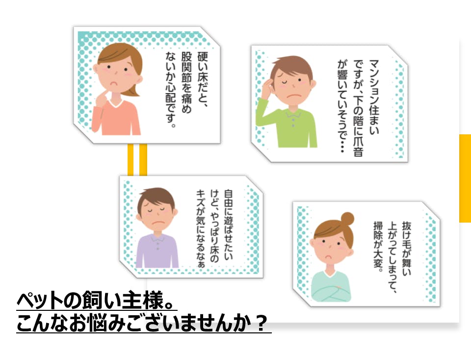 現在、住宅市場の36%を占めるペット愛好家、さらにコロナ渦からペットを飼育する家庭が急増しています。しかしながら、大切な家族であるペットと安心・安全・快適に暮したいが?・・・・・ペット関連の展示会、アンケート調査によれば、床に関する悩みが非常に多いのが現状です。実際の床に敷き、見た目のインテリア性、クッション性と耐久性、防滑性、洗えるメンテナンス性を体感いただき多くのかたにビックリされています。