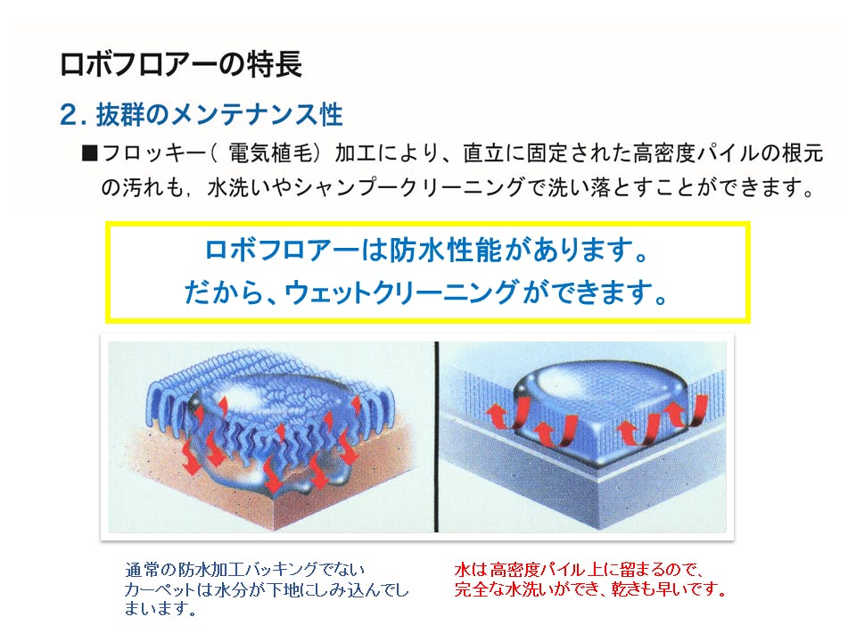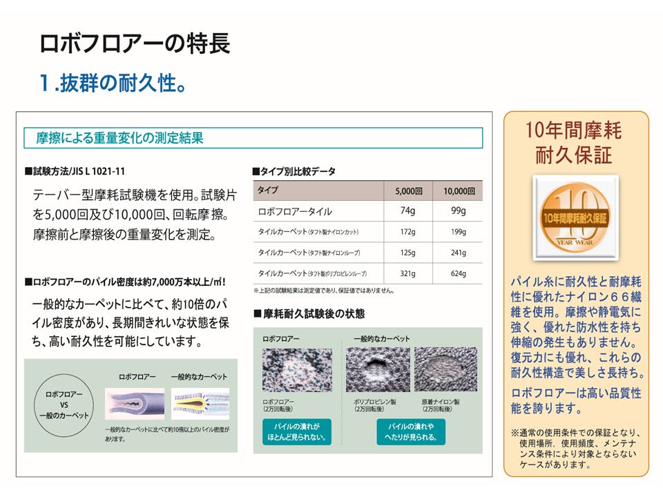 1.抜群の耐久性とメンテナンス性 超高密度パイルは一般的なカーペットの約10倍(7000万本以上/㎡)