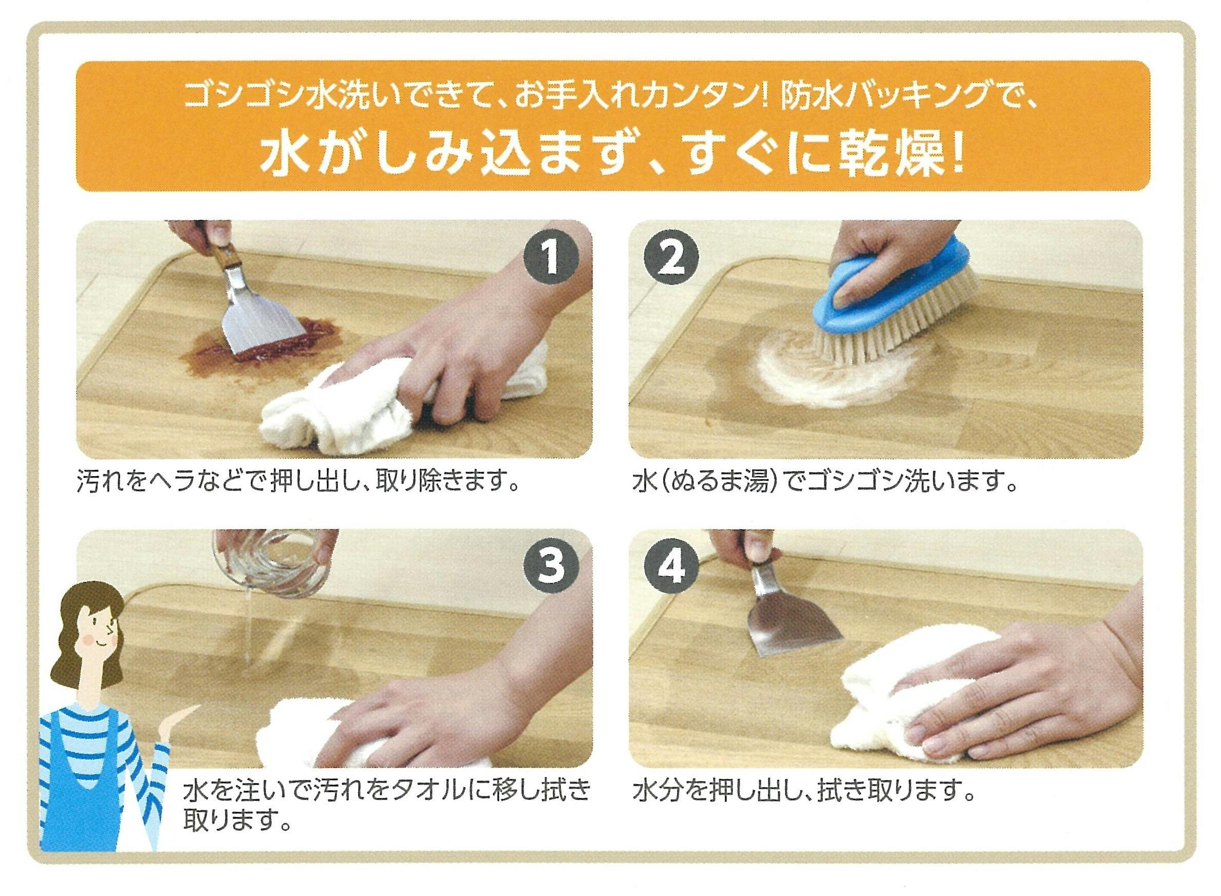 ④ゴシゴシ洗えるからいつも清潔。しかも、裏面は防水性バッキングで水がしみ込まずにすぐに乾燥。
