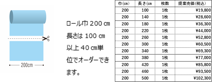 ・サイズ展開:幅200cm×長さ100cm~500cmまでの下記表の11サイズからお選びいただけます。