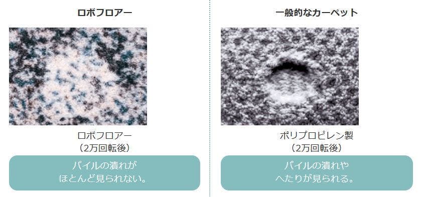 A:ロボフロアーは一般的なカーペットに比べて約10倍のパイル密度があり、パイルがぎゅっと集まり一本 一本が立っている状態です。キャスター耐久テストでは一般的なカーペットに比べて、パイルの潰れがほとんど見られません。