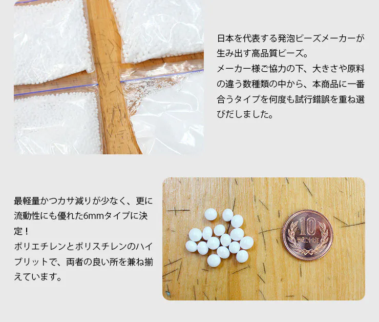 何度となく、ビーズの大きさや種類を替え座ってみる、横になるを繰り返し、耐久性や触感を体感しました。