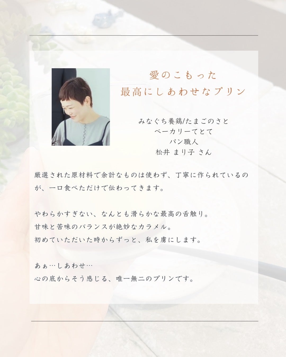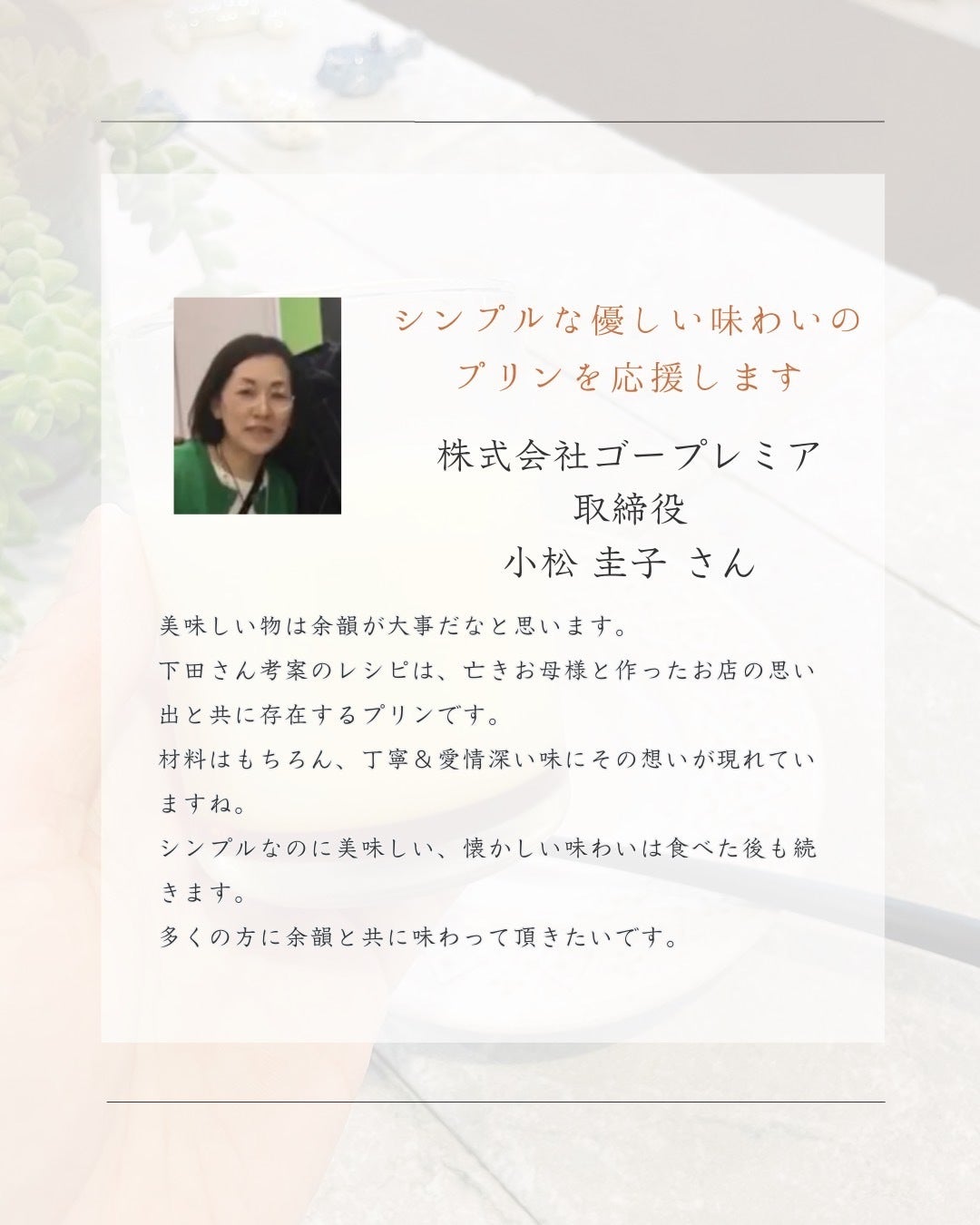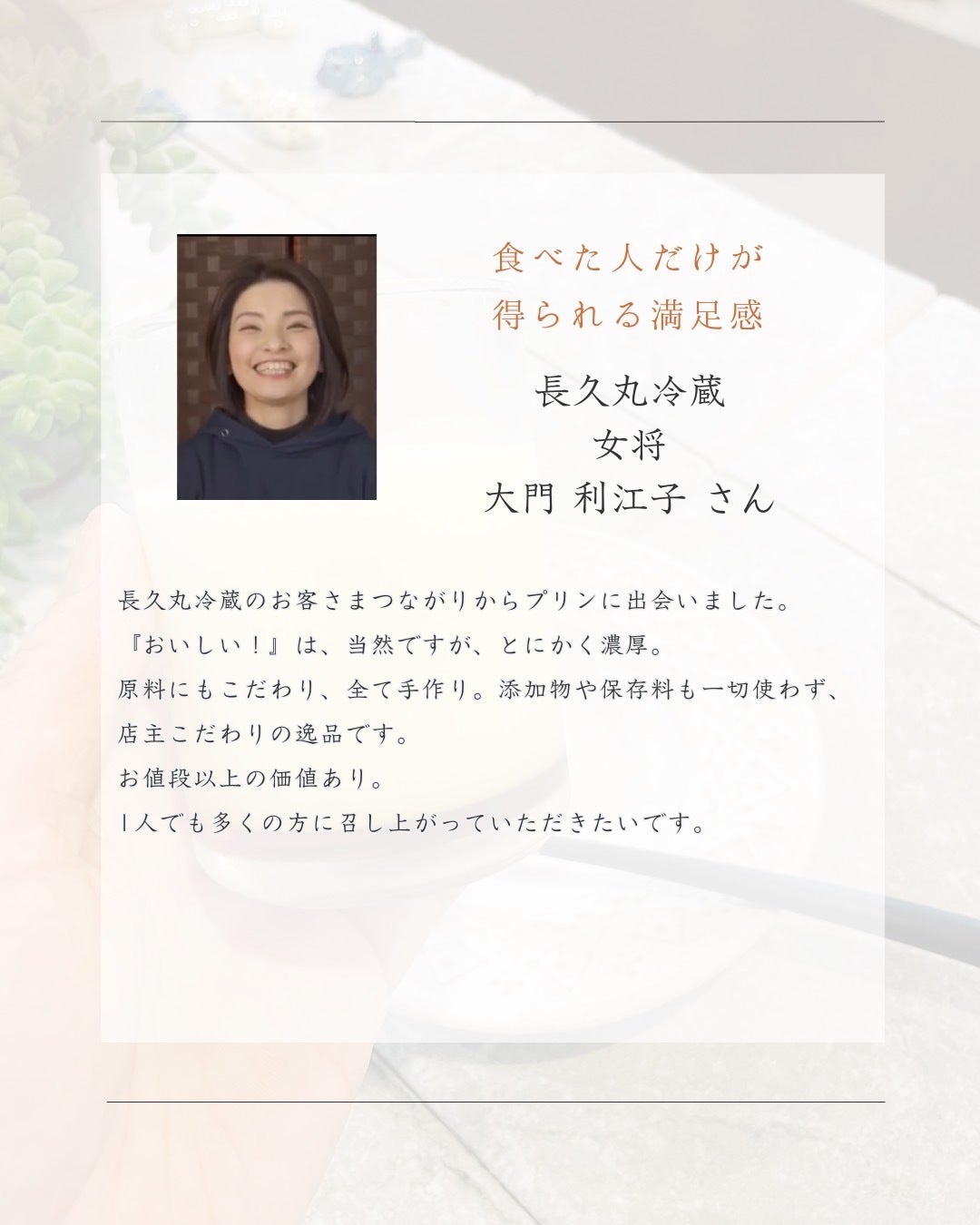 母も大好きだった私が作るこの思い出のプリンを、これからもたくさんの方に楽しんでいただきたいです。