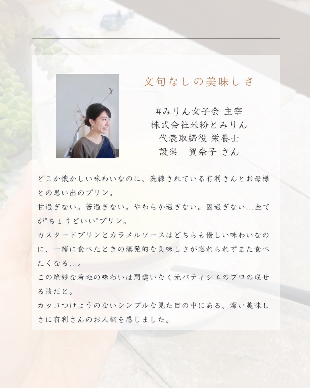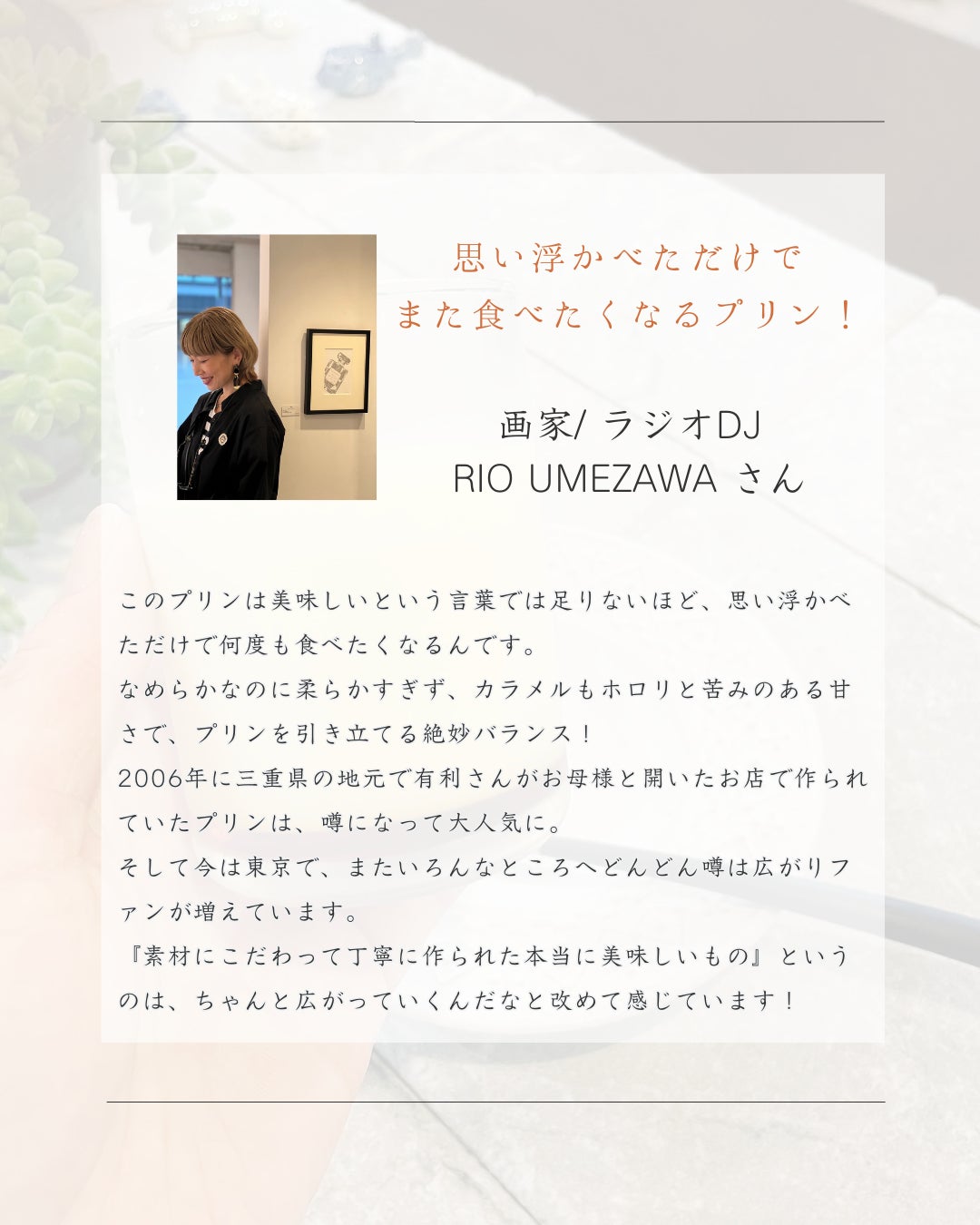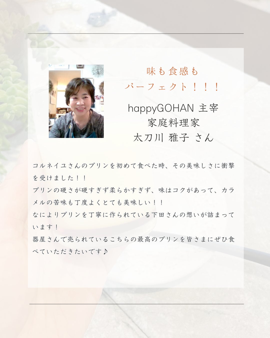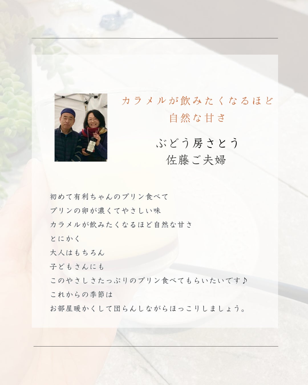 母も大好きだった私が作るこの思い出のプリンを、これからもたくさんの方に楽しんでいただきたいです。