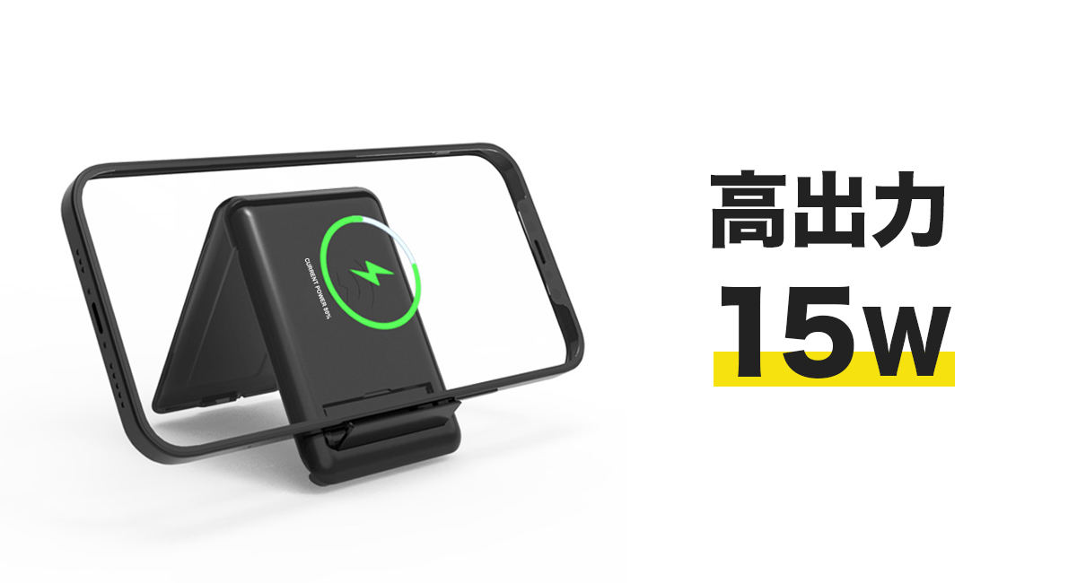 初の15W高速充電に対応。スマホスタンドとして動画や映画を見ながらワイヤレス充電ができます。