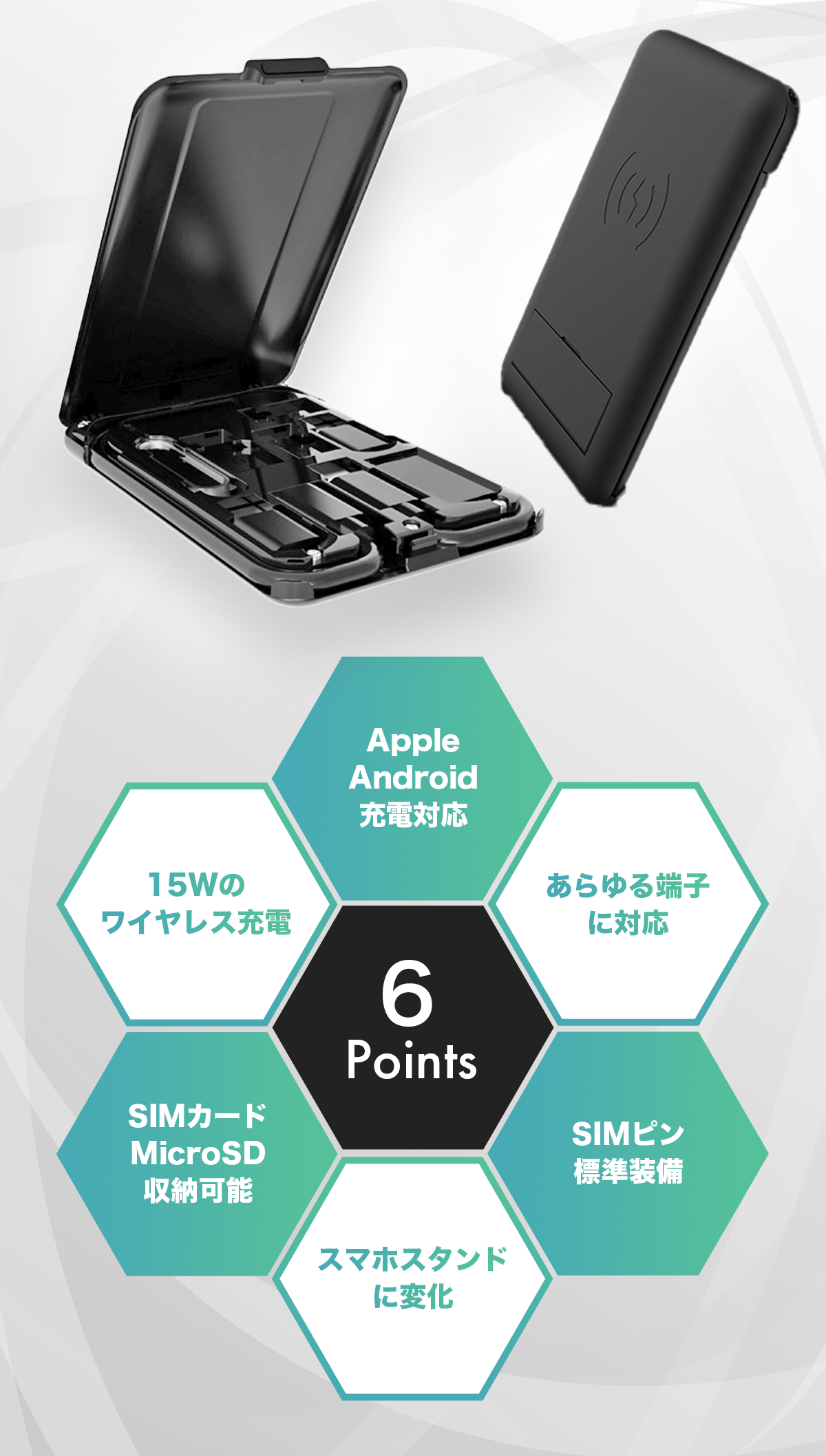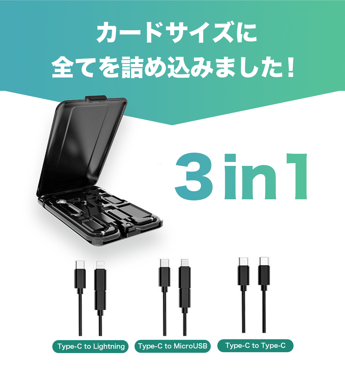 充電ケーブルやSIMカードをすっきり収納できるカードケース。