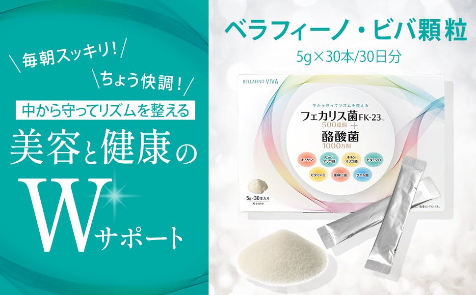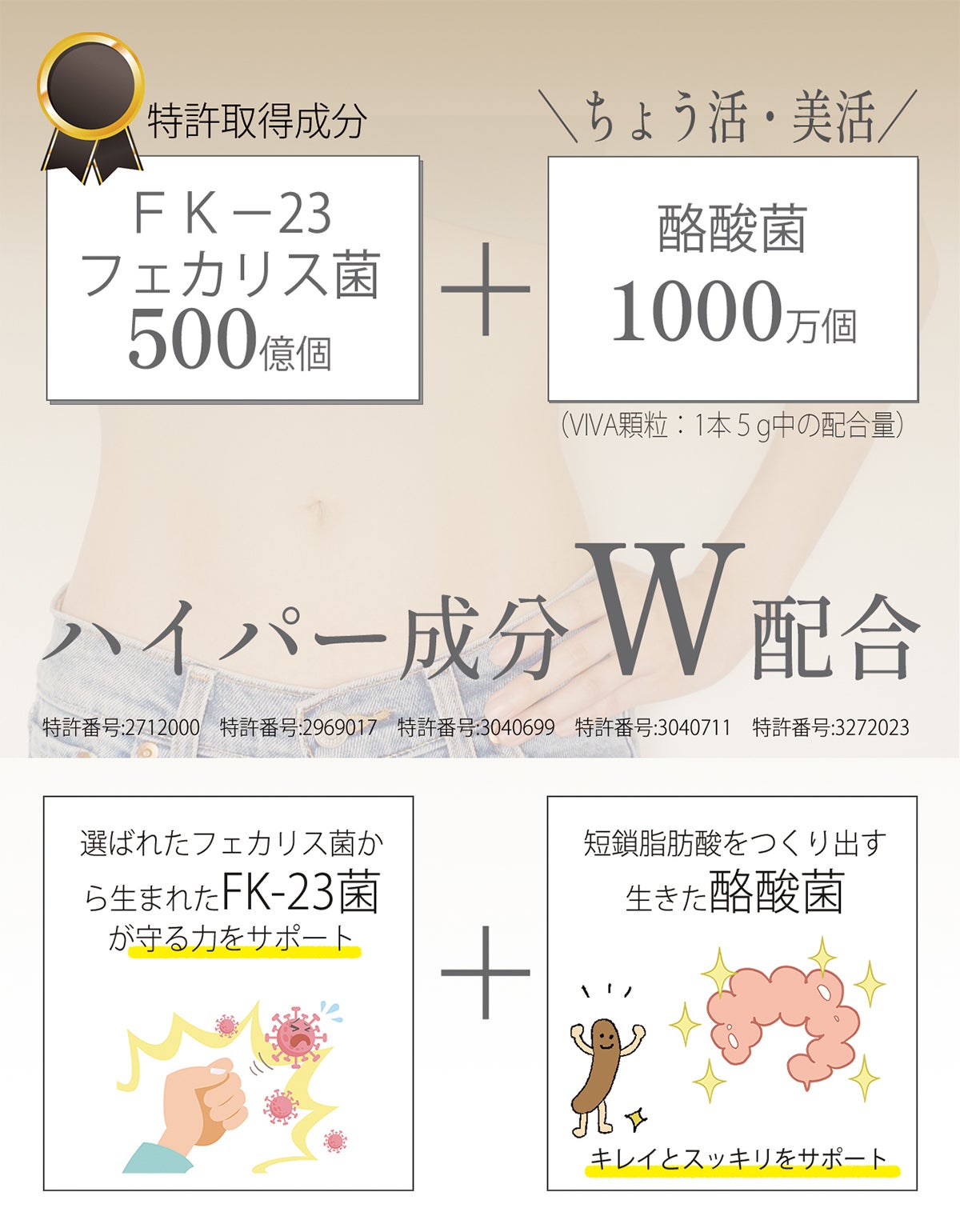 ベラフィーノでは、32年前から栄養を補うためのサプリメントと一緒に、腸の状態をよくするための独自配合の「FK-23殺菌フェカリス菌・オリゴ糖・キチンオリゴ糖・シソ油・ビタミンC・キトサン配合のちょう活サプリVIVA」を合わせて摂ることをおすすめしていました。腸の状態が良いと栄養の吸収が良くなることを感じ取っていた薬剤師である母(創業当初、副社長)は、その後さらに、腸活を同時並行することで栄養の吸収が上がることが愛用者の方々の体験談からも確信していったからです。