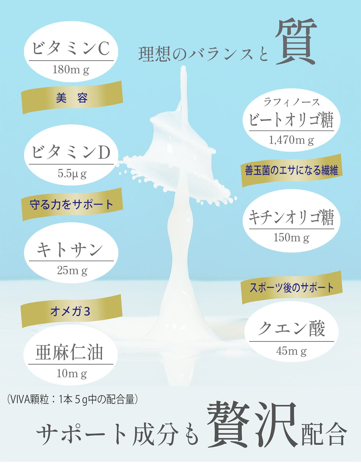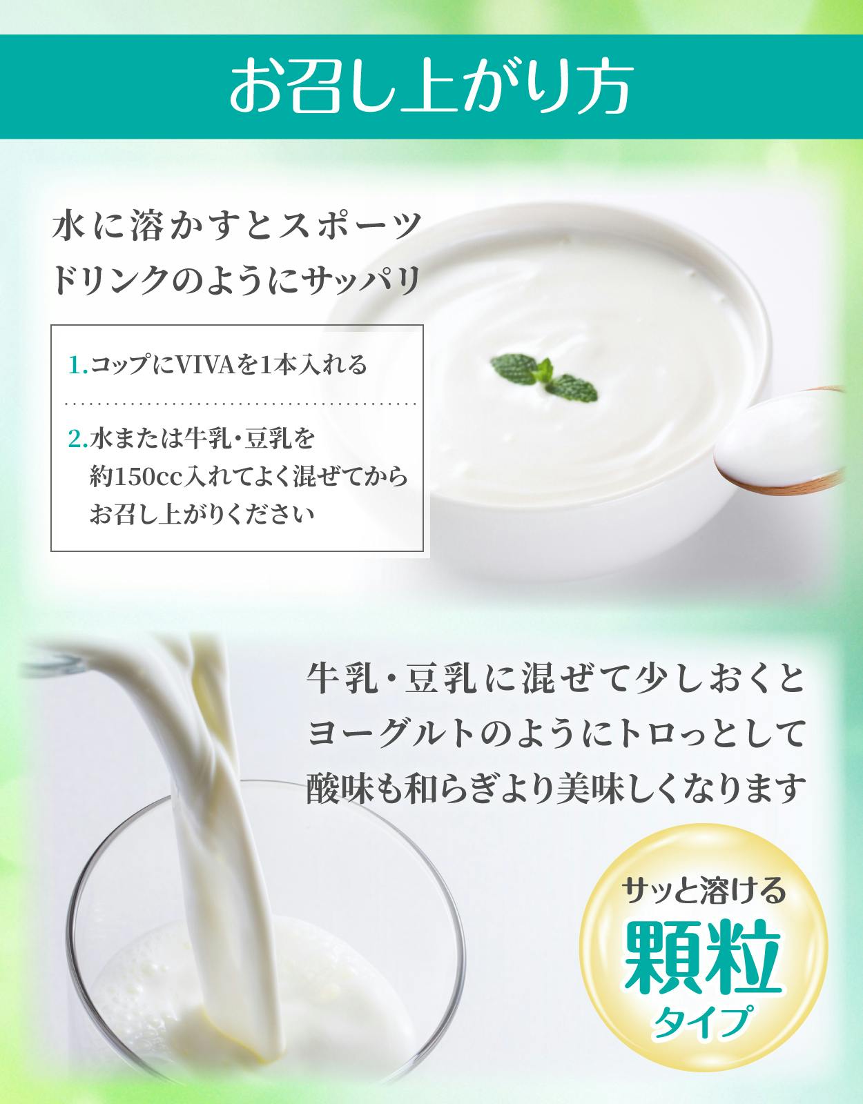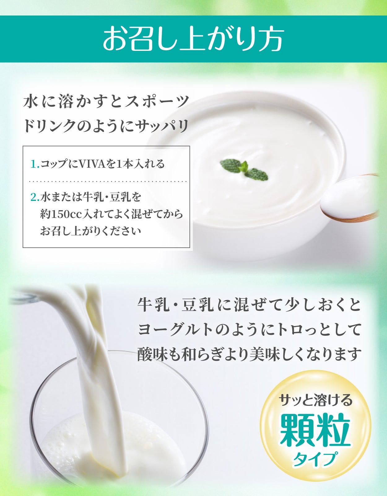2024/07/05 11:45改めまして、ご支援頂きました皆様に心より感謝申し上げます。今年の梅雨は、どうしてしまったのか?早くも、猛暑日が続いております。このような時に、まさにお役立ていただきたいサプリメントになりますので是非、お召し上がりください。腸活にうれしい働きの、有用菌を腸まで届けるプロバイオティクスの殺菌「フェカリス菌・酪酸菌」に、有用菌を育て善玉菌の増殖、活性化をサポートする プレバイオティクスの「ビートオリゴ糖・キチンオリゴ糖」と腸内環境の全面サポートを考えた設計のシンバイオティクスの発想から生まれた【VIVA顆粒】 さらに、トレーニングする方や、梅雨バテにもうれしい成分「クエン酸・ビタミンC・D」配合ののおすすめのお召し上がり方は、①水・・・スポーツドリンクのように、控えめな甘さと、しっかりした酸味を感じる飲み方②豆乳・・・混ぜて少しするととろみがでで、酸味が和らぎます。③牛乳・・・混ぜて少しするととろみがでで、酸味が和らぎます飲むヨーグルトのように。 ④炭酸・・・暑い日におすすめ!水よりもよりスッキリと飲めて酸味がやや苦手な方でも何故か美味しく感じる!⑤プロテインに混ぜる・・・酸味がフルーツフレーバーのようになりプロテインをよりおいしく飲みやすくなります。熱い時期には、特におススメです!栄養価的にも、スポーツ後の疲労回復に、プロテインとクエン酸+ビタミンCで疲れを回復に!どうぞ、お好みの飲み方をみつけてこの夏を元気に乗り切るお役にたてますように願っております。今後ともどうぞ、宜しくお願い致します。 もっと見る