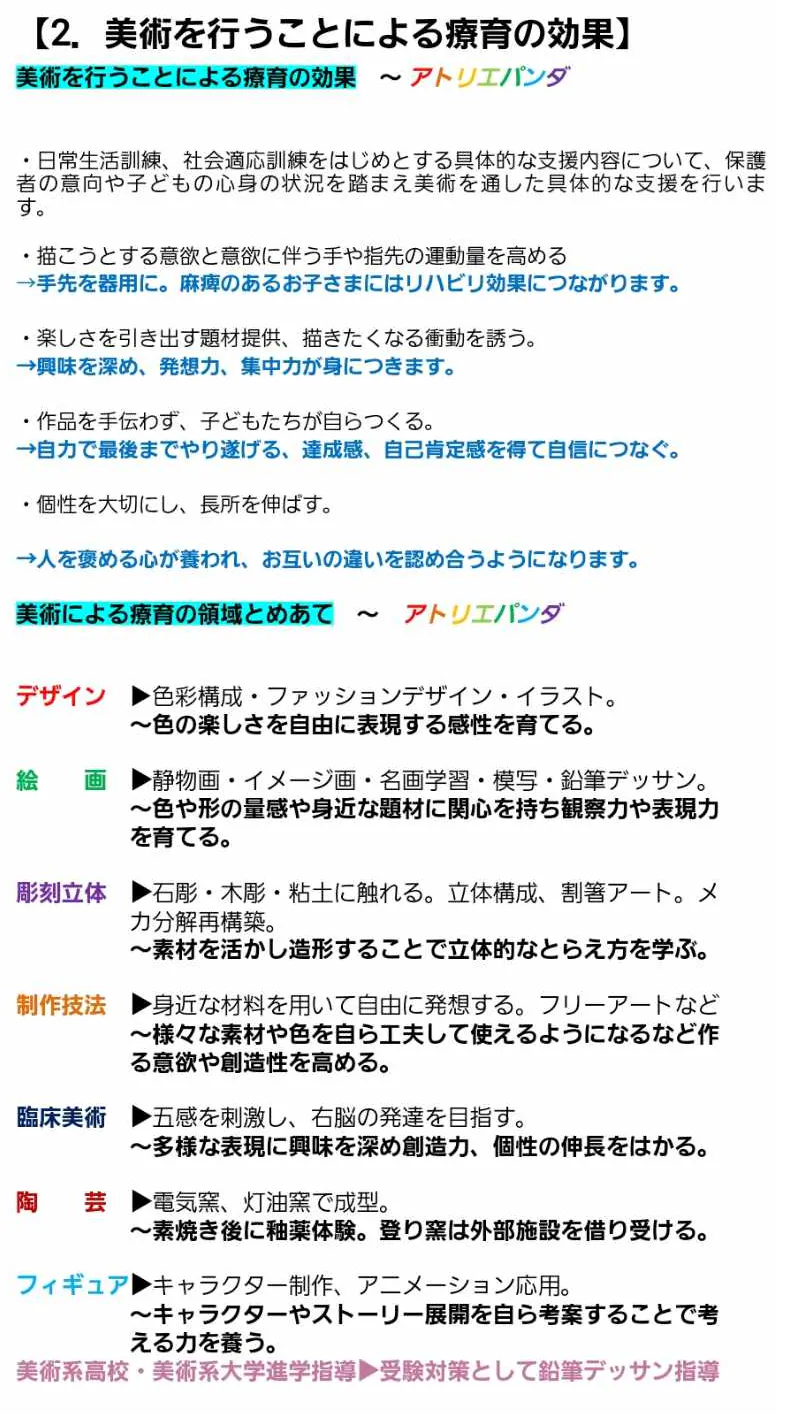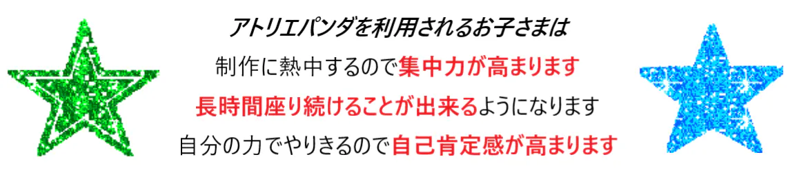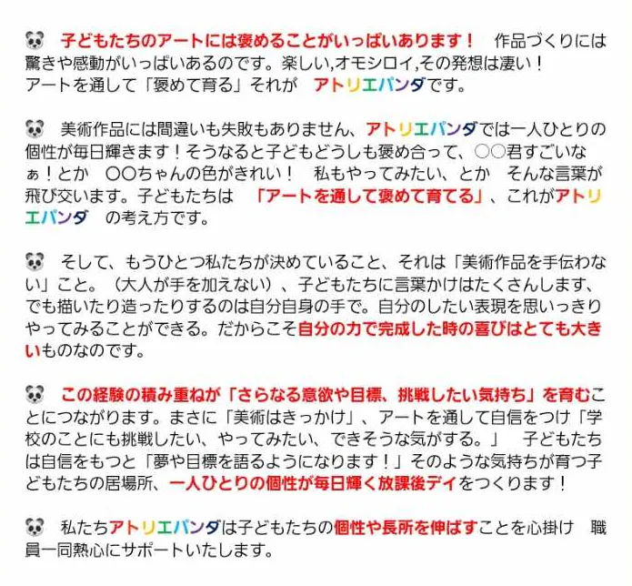 🐼 子どもたちのアートには褒めることがいっぱいあります! 創作活動、作品づくりには驚きや感動がいっぱいあるのです。楽しい,オモシロイ,その発想は凄い!アートを通して「褒めて育る」それが アトリエパンダです。子どもたちは 「アートを通して褒めて育てる」、これがアトリエパンダ の考え方です。私たちアトリエパンダは子どもたちの個性や長所を伸ばすことを心掛け 職員一同熱心にサポートしています。