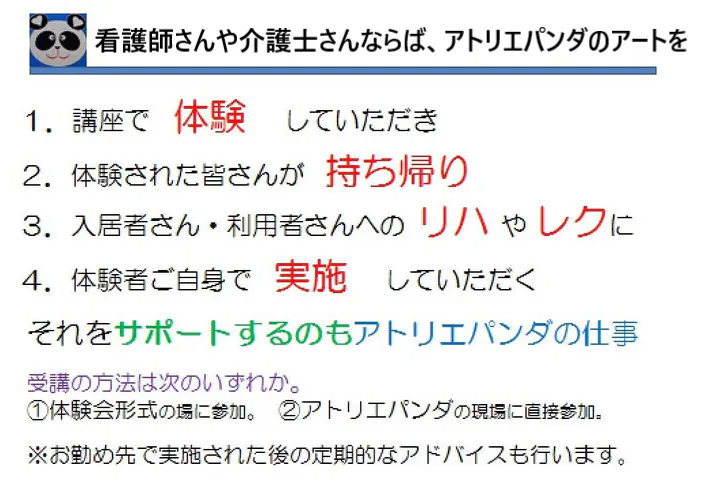 ⑱63000円:【アトリエパンダ美術指導者出張美術講師(各種団体様向け、福利厚生の一環として)】施設、企業、大学、学校、保育園等へ アトリエパンダ代表者:半田育子が出張講師「年2回実施」、開始時期は2024年2月~ 出張先でのアート実施所要時間は2時間以内、実施日はご希望者様と適宜相談。(アトリエパンダ出張に関わる交通費、材料費×人数分は別途頂戴致します)