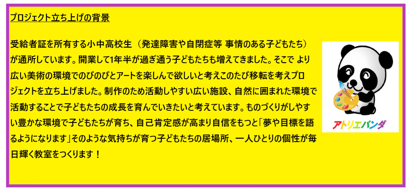 - 受給者証を所有する小中高校生(発達障害や自閉症等 事情のある子どもたち)が通所しています。開業して1年半が過ぎ通う子どもたちも増えてきました。そこで より広い美術の環境でのびのびとアートを楽しんで欲しいと考えこのたび移転を考えプロジェクトを立ち上げました。制作のため活動しやすい広い施設、自然に囲まれた環境で活動することで子どもたちの成長を育んでいきたいと考えています。ものづくりがしやすい豊かな環境で子どもたちが育ち、自己肯定感が高まり自信をもつと「夢や目標を語るようになります」そのような気持ちが育つ子どもたちの居場所、一人ひとりの個性が毎日輝く教室をつくります!