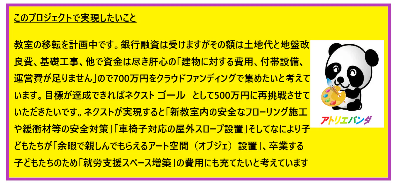 教室の移転を計画中です。銀行融資は受けますがその額は土地代と地盤改良費、基礎工事、他で資金は尽き、肝心の「建物に対する費用、付帯設備、運営費が足りません」ので700万円をグランドファンディングで集めたいと考えています。目標が達成できればネクストゴールとして500万円に再挑戦させていただきたいです。ネクストゴールが実現すると「新教室内の安全なフローリング施工や緩衝材等の安全対策」「車椅子対応の屋外スロープ設置」、そしてなにより子どもたちが「余暇で親しんでもらえるアート空間(オブジェ)造り」、卒業する子どもたちのため「就労支援スペース増築」の費用にも充てたいと考えています。