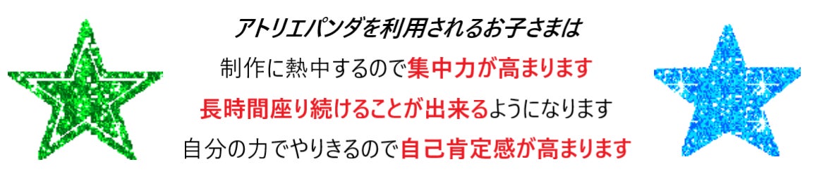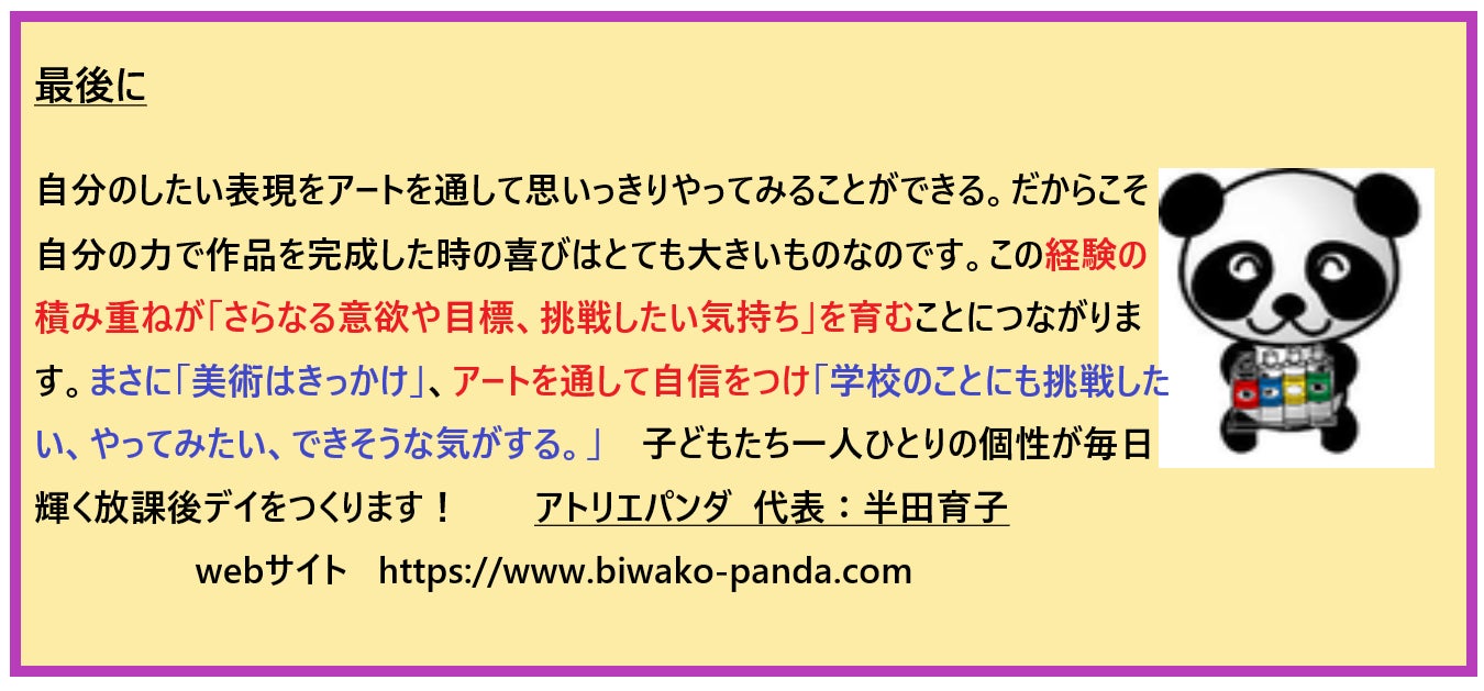 🐼 子どもたちのアートには褒めることがいっぱいあります! 創作活動、作品づくりには驚きや感動がいっぱいあるのです。楽しい,オモシロイ,その発想は凄い!アートを通して「褒めて育る」それが アトリエパンダです。子どもたちは 「アートを通して褒めて育てる」、これがアトリエパンダ の考え方です。私たちアトリエパンダは子どもたちの個性や長所を伸ばすことを心掛け 職員一同熱心にサポートしています。
