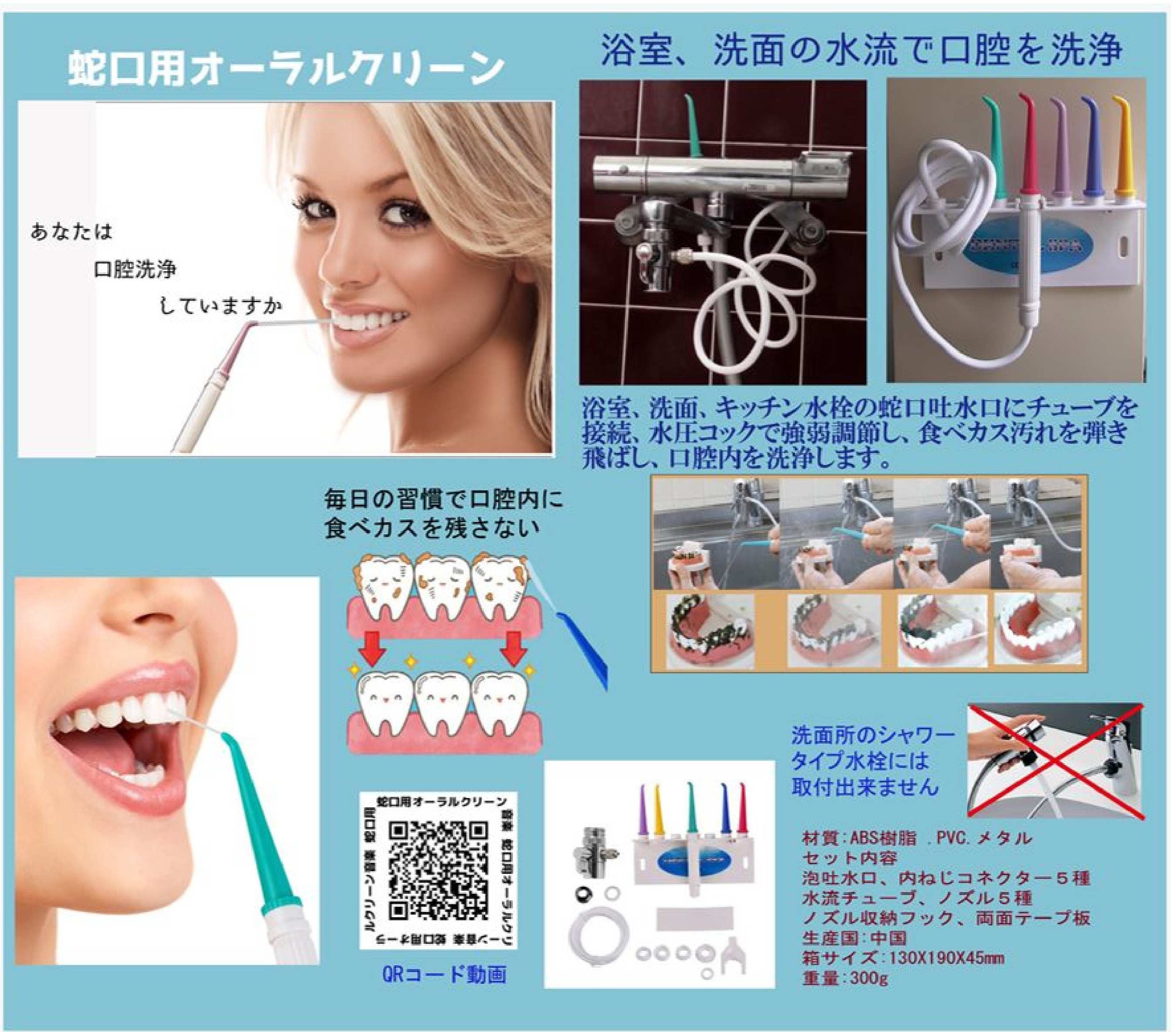 ・商品名 蛇口用オーラルクリーンです。浴室、洗面所、台所の水栓蛇口に本体を取り付け、食べ物カス、口腔洗浄をジェット水流で洗い流します。ジェット水流は、本体コックを左に回すと弱水流から強水流に調節できます。歯石の予防は毎日の歯の手入れが重要です。歯石を作らない為に日頃の習慣にしてください。デメリットは、シャワー付き洗面水栓には取付が出来ません。お風呂で使用すると水跳ねの心配なく、使用できます。お風呂使用後は、pvcチューブを外して、湿気のない場所にノズル収納してください。写真を参考にしてください。浴室、洗面、キッチン水栓吐水口に、蛇口オーラルクリーン部品を取り付けます。蛇口水栓メーカーTOTO、KVK、LIXIL、SANEIは、取付できます※記載の企業様の純正品ではございません。