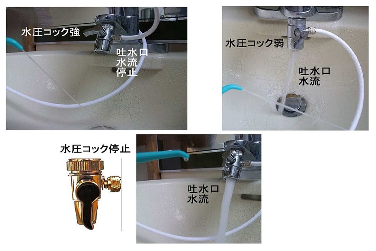 歯を磨いた後でも、ジェット水流のノズルを歯茎、歯の隙間を当てると食べ物カス、口腔の汚れが、流れていきます。水圧の強弱は、水圧コックで希望の水圧調整できます。水道水を直接使用する為、本体の手入れは必要ありません。5本のノズルで家族それぞれ使用でき衛生的です。持運びタンク式のタイプは、使用後の水タンク清掃が毎回手間がかかります。水流で水圧を変える為、バッテリーは必要ありません。歯を磨いた後の最後の口腔洗浄でお口の中がすっきりします。