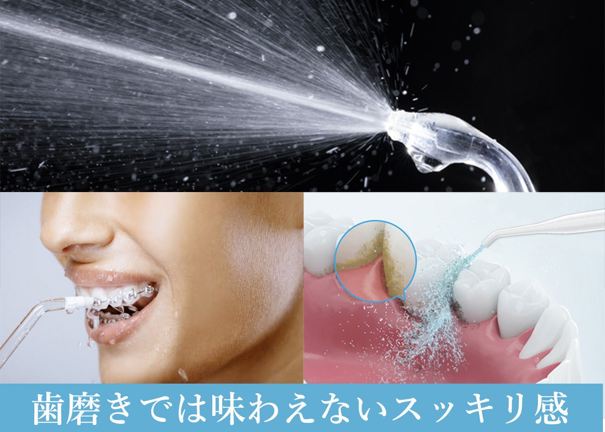 ①強水流・高水圧のデンタルウォッシャー ②歯垢、汚れ、口臭、サッパリ ③高周波パルス1600、高水圧120PSI、IPX7防水