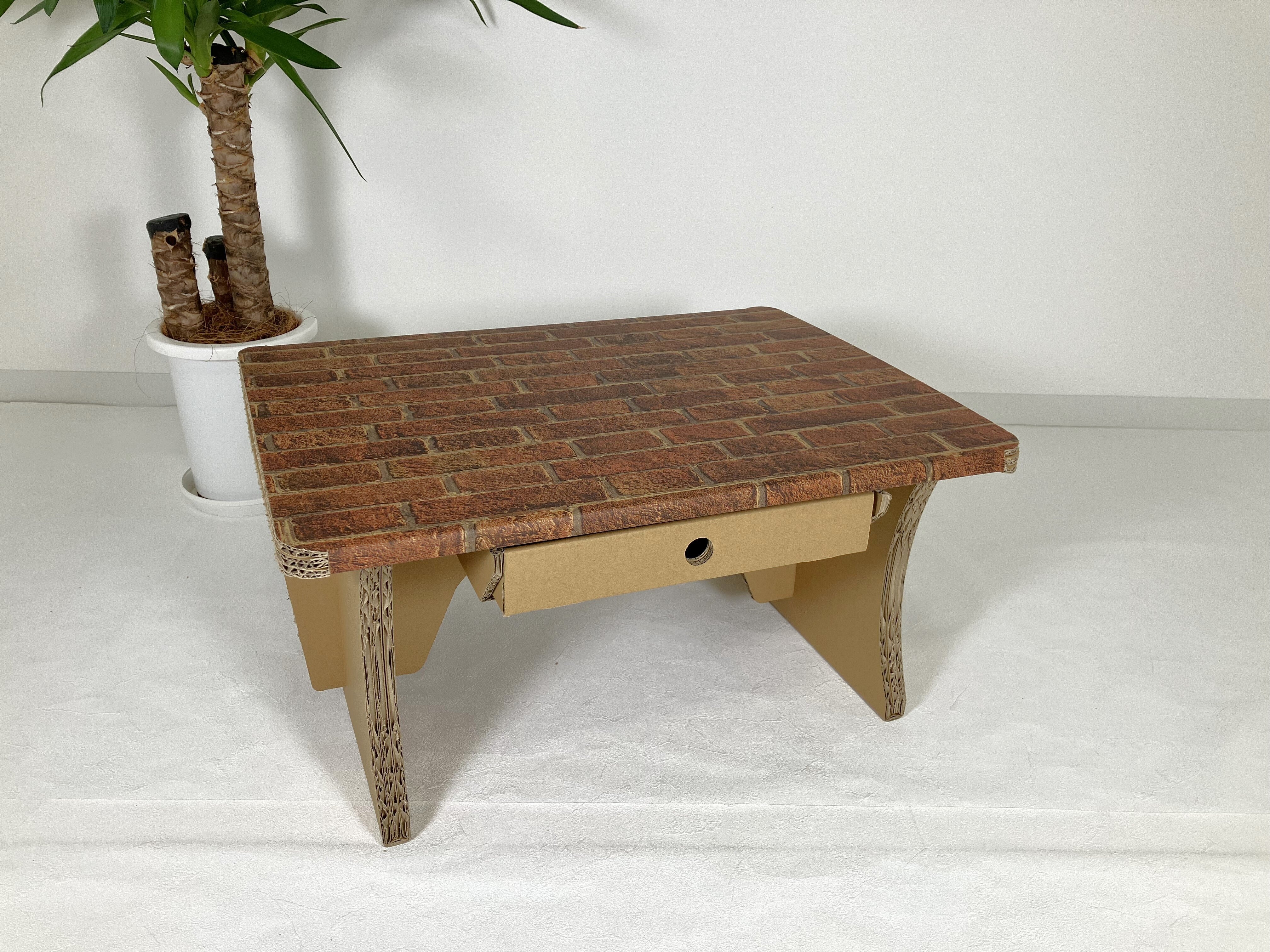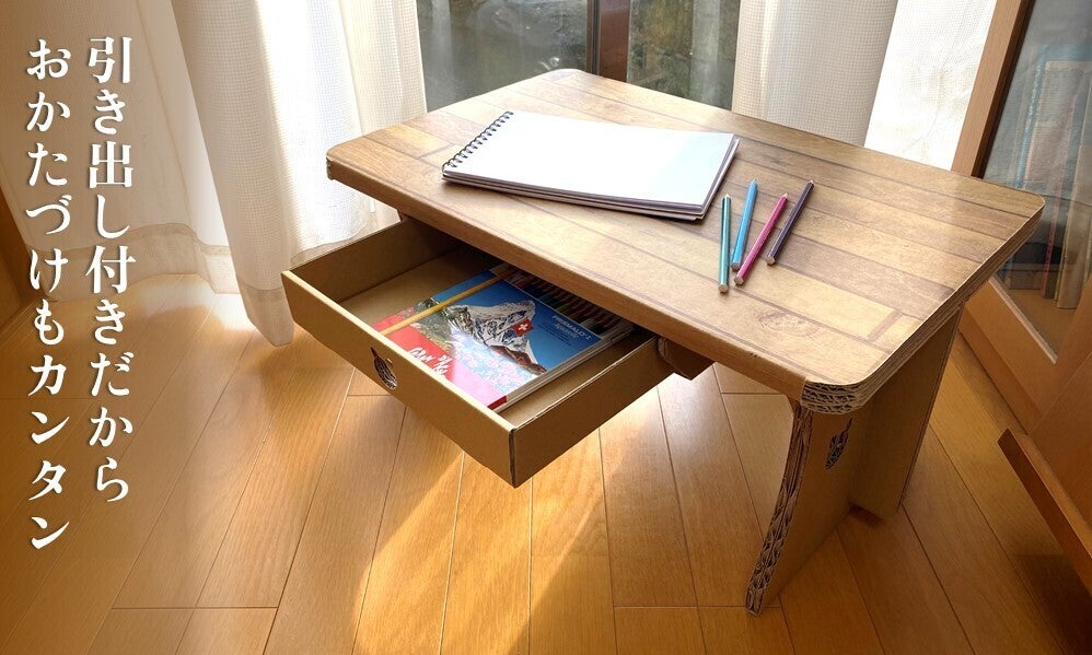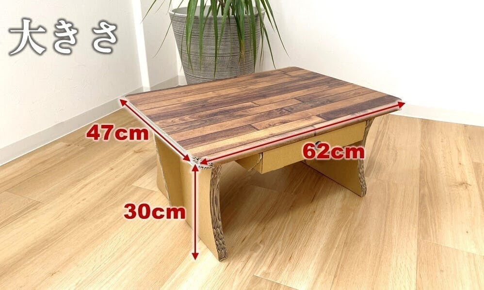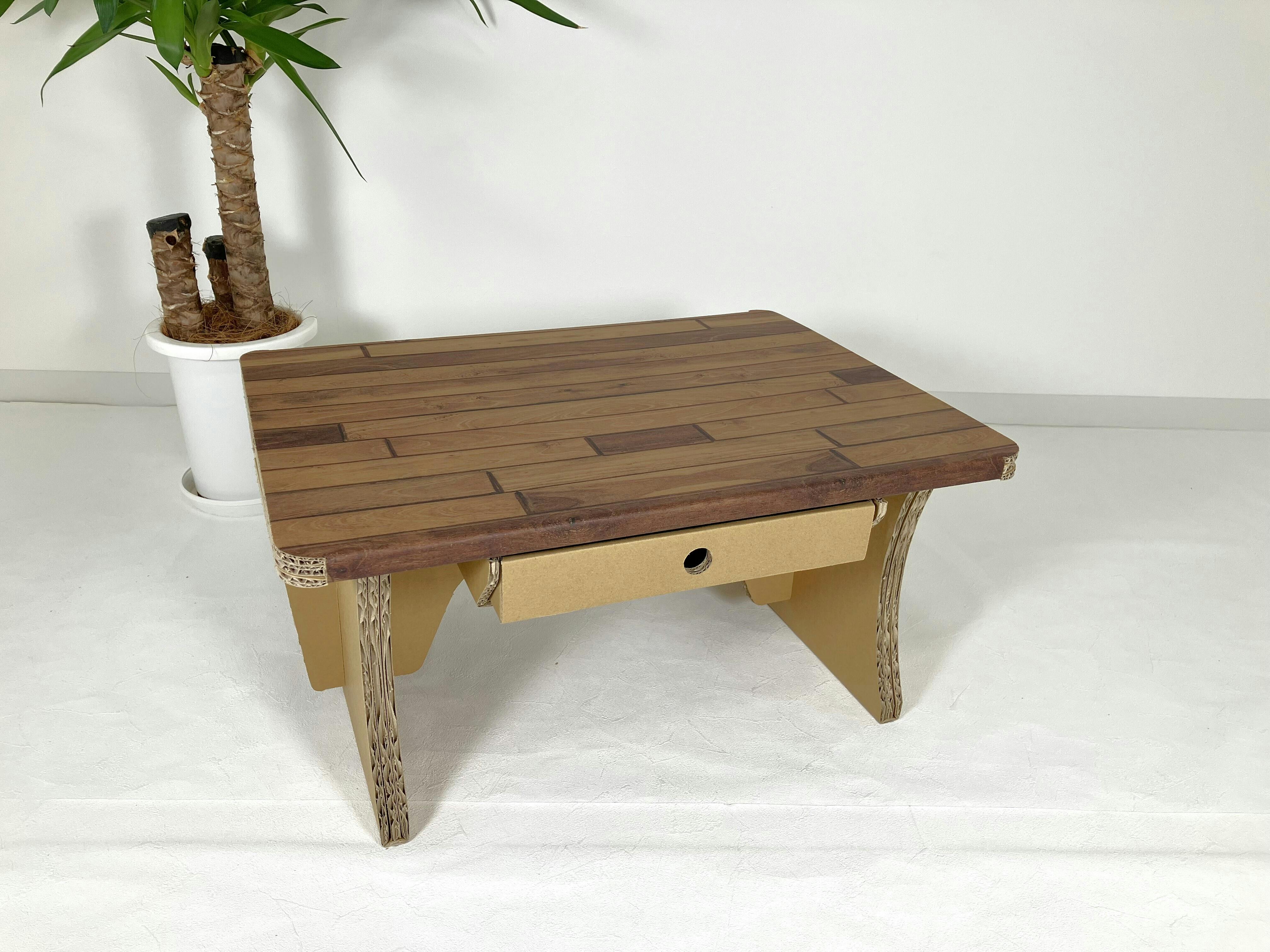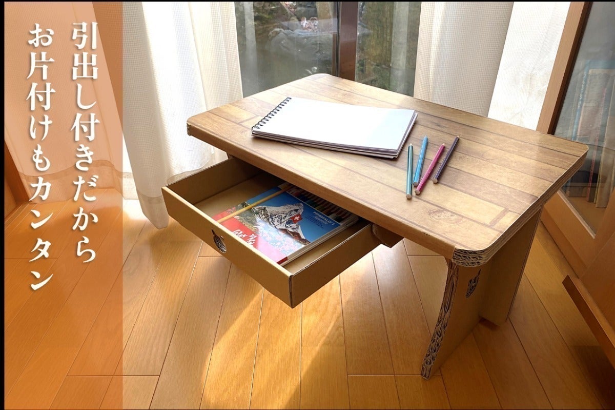元々ある折り曲げ線に沿って折る、溝に段ボールを差し込むといった作業を行うだけで、引出し付きのローテーブルを作ることが出来ます。