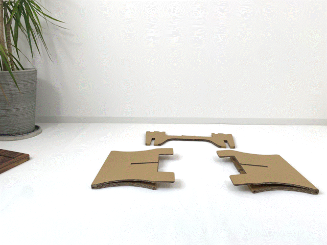 天板は裏面にあるツメで脚部と連結させることで、つなぎ目が見えないように工夫しています。単なる差込み方式ではなく、段ボールを巻きこむようにしているため、足が簡単に外れないようになっています。