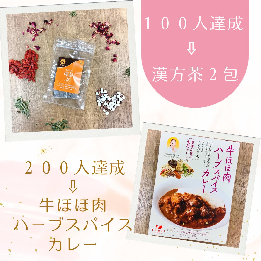支援者数100人 ➡「漢方茶(体を温めるお茶)2包」を支援者様全員にプレゼントします!