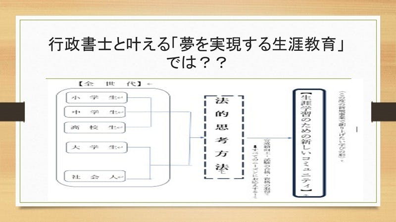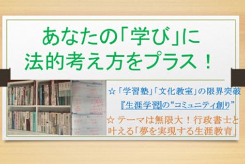 具体的な形式として、行政書士事務所として、「生涯教育」に関する事業を立ち上げ、全ての世代の方が、それぞれ学びたい科目・テーマについて、必要な知識の涵養ができるようなコミュニティを創りたいと考えています。あらゆる目的で法学を学ぶ方のサポート、一般教養として、あらゆる科目を学ぶ方々のご指導、介護保険や著作権などの法制度に関するセミナーなど、「学びたい方々をサポートするためのインフラ創り」をプロジェクトを通して成し遂げたいと考えております。