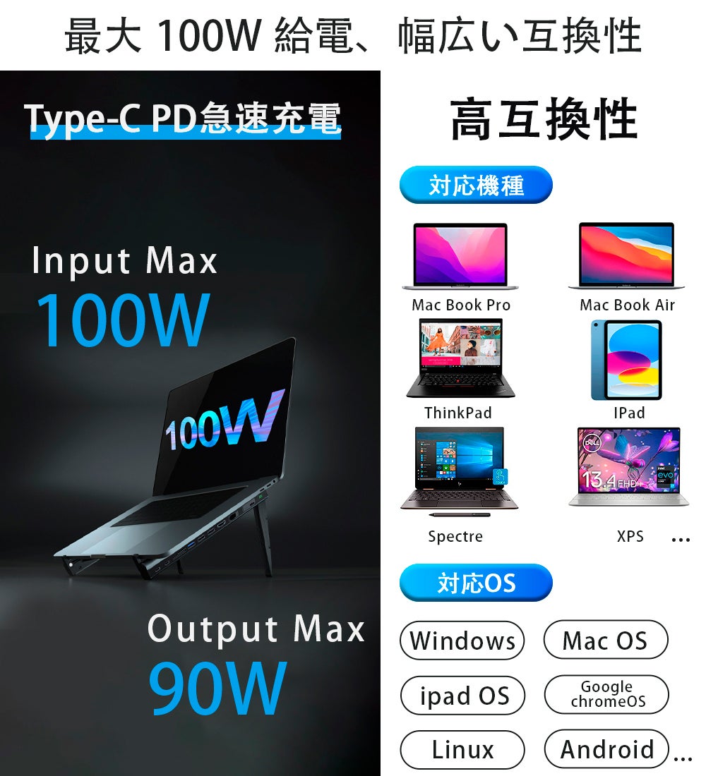 Type-C仕様のPCデバイスで適用可能、幅広い互換性。