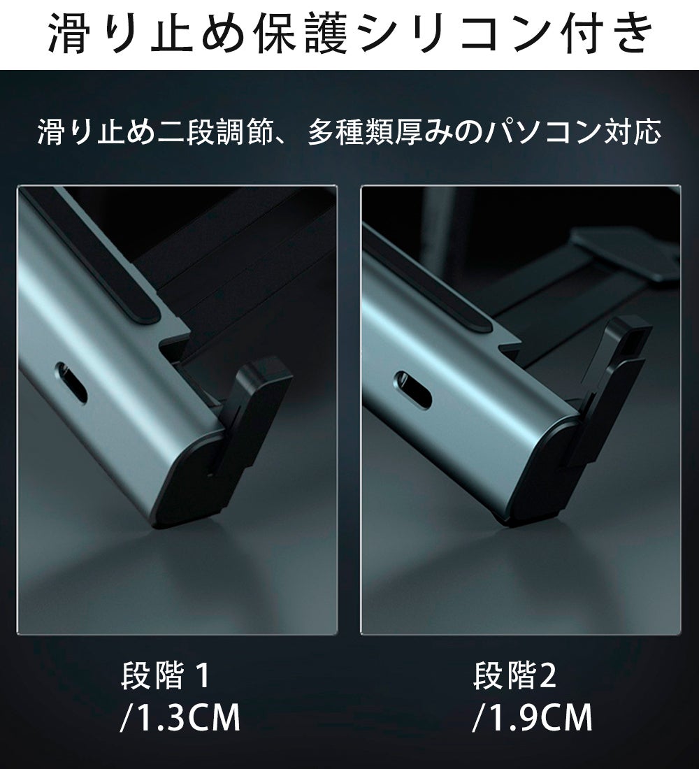 パソコンが当たる部分には2段階のシリコン製の滑り止めゴムがつき、ラップトップの厚さに応じて適切な段階を選択可能。パソコンを傷つけにくく、落下する心配もありません。