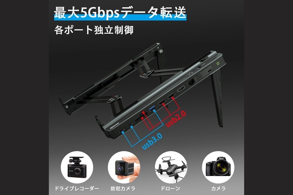 11個のポートを1台に備え、PCデバイスに必要な全てのポートを、コンパクトな一体にまとめた多機能スタンドです。
