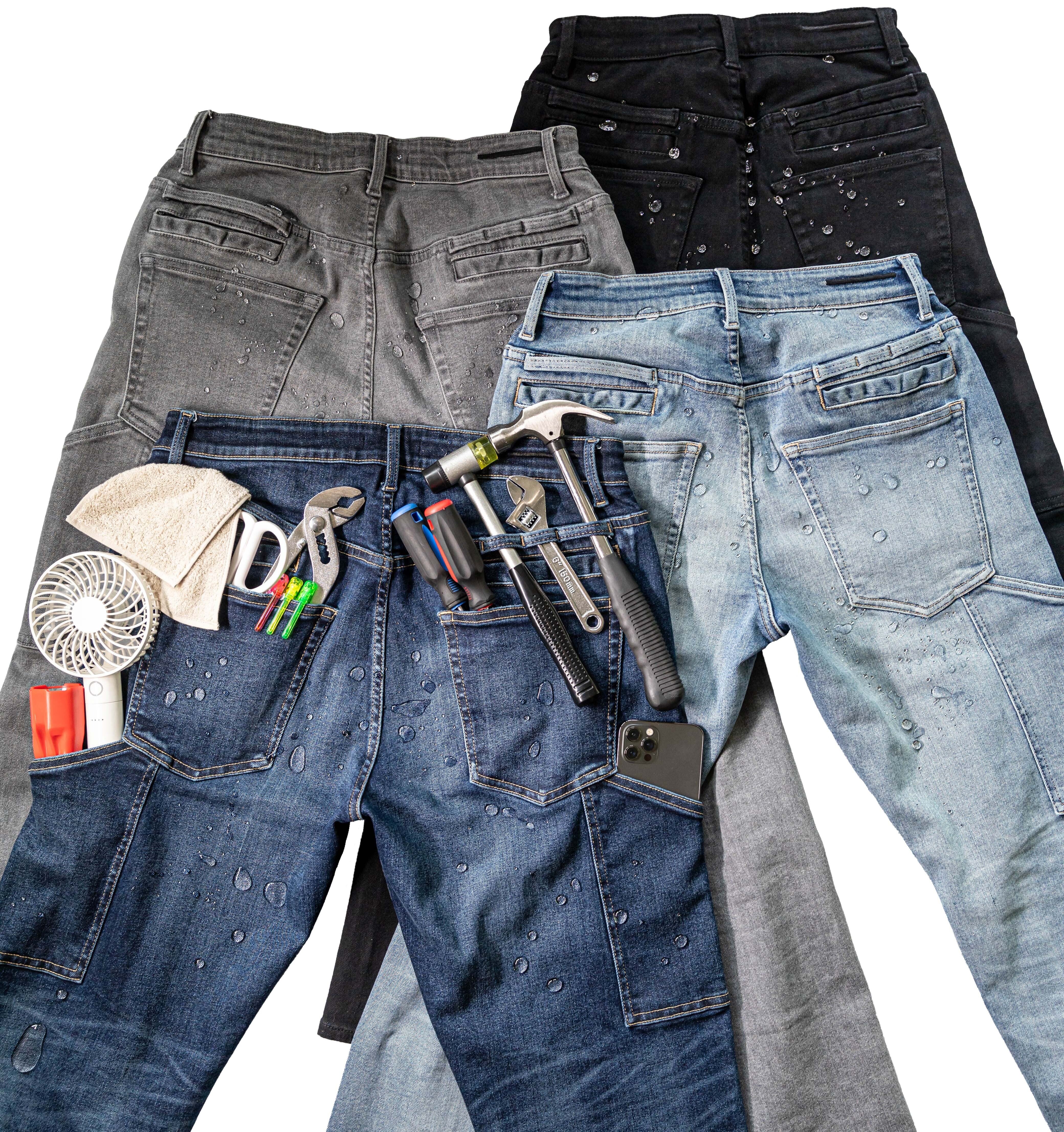 【限定100着】スマホに最適6ポケット/無段階ウエスト調整/2倍伸びる超撥水デニム